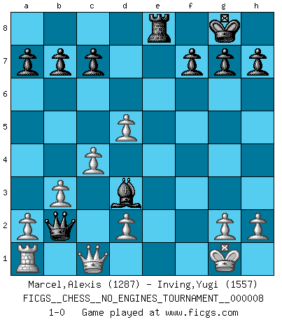 Last move : 1-0 2008 September 29 22:33:18 [Event "FICGS__CHESS__NO_ENGINES_TOURNAMENT__000008"] [Site "FICGS"] [Date "2008.05.16"] [Round "1"] [White "Marcel,Alexis"] [Black "Inving,Yugi"] [Result "1-0"] [WhiteElo "1287"] [BlackElo "1557"] 1.f4 e5 2.fxe5 Nc6 3.Nf3 d6 4.exd6 Bxd6 5.e3 Nf6 6.Be2 O-O 7.O-O Bf5 8.b3 Nd5 9.Bb2 Qe7 10.c4 Ndb4 11.Na3 Nd3 12.Bxd3 Bxd3 13.Re1 Bxa3 14.Bxa3 Qxa3 15.Nd4 Nxd4 16.exd4 Qb2 17.d5 Rfe8 18.Rxe8+ Rxe8 19.Qc1 1-0 This chess game has been lost on time (started : 2008.05.16 23:49:14) Bird : From gambit Kingside Castling by player Black (move 6) Kingside Castling by player White (move 7) Player White won this chess game. Follow this game move after move (download)When you see a good move, look for a better one. (Emanuel Lasker) Mutter, ich bin eben Ex-Weltmeister geworden. --beim nach Hause Kommen nach dem Verlust des WM-Titels an Mihail Botvinnik -- (Mikhail Nekhemyevich Tal) No puedes jugar al Ajedrez si eres de corazón noble. (Proverbio Francés) Une platitude souvent récitée à propos des Echecs est qu'une des choses les plus difficiles à réaliser est de gagner une position gagnante. Cela ne manque pas de sens mais, pour ma part, j'ai toujours trouvé plus difficile de gagner une position perdante. (Tim Krabbe) If you work for a living, why do you kill yourself working ? (Tuco to a chicken in The Good, The Bad and The Ugly)