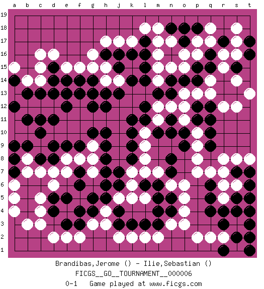 Last move : 0-1 2006 October 13 8:47:8 [Event "FICGS__GO__TOURNAMENT__000006"] [Site "FICGS"] [Date "2006.07.18"] [Round "1"] [Black "Brandibas,Jerome"] [White "Ilie,Sebastian"] [Result "0-1"] 1.q4 r16 2.d4 d16 3.q10 d10 4.q15 r15 5.r14 q14 6.p14 q13 7.r13 p13 8.q16 q17 9.o14 p17 10.p15 o13 11.n13 r12 12.s15 s16 13.s13 s12 14.t16 t13 15.o17 o16 16.n16 n17 17.o18 n15 18.n14 m16 19.n18 m18 20.p18 q18 21.r17 s17 22.p12 o12 23.q12 o11 24.q11 m14 25.m13 l13 26.l14 m15 27.l17 m17 28.l12 k13 29.o10 m11 30.t17 s18 31.k14 m12 32.j13 k12 33.l11 j12 34.m10 s14 35.n11 n12 36.n10 j14 37.h13 k15 38.j15 h14 39.h12 j11 40.k10 h11 41.g12 g11 42.g14 h15 43.j16 f12 44.g13 g15 45.f14 f15 46.e14 e15 47.d14 d12 48.e12 e11 49.e13 c15 50.f13 c14 51.f11 f10 52.c13 c12 53.e9 e10 54.g10 g9 55.h10 j10 56.h9 j9 57.h8 j8 58.f9 g8 59.h7 g7 60.j7 k7 61.j6 k6 62.h5 j5 63.h6 h4 64.j4 k5 65.g4 h3 66.g5 e7 67.d8 d7 68.d9 g3 69.f4 c7 70.c10 f12 71.c11 b12 72.d11 f11 73.f7 f8 74.f6 e8 75.c8 b8 76.e5 e2 77.e3 d2 78.f3 f2 79.j3 j2 80.k3 k2 81.l3 l2 82.m3 m2 83.k8 n3 84.m4 l8 85.k9 l9 86.k11 n6 87.l15 l10 88.b6 b7 89.b9 c5 90.c6 d6 91.b5 c4 92.b4 c3 93.d5 b3 94.a7 a4 95.a8 a5 96.n4 o3 97.a9 a6 98.b13 a13 99.a14 b14 100.a12 a15 101.d13 o4 102.n5 o5 103.m6 m7 104.l6 l5 105.n7 o6 106.m5 l7 107.n8 r6 108.q6 r5 109.q5 q7 110.r4 r8 111.s5 s6 112.t4 s3 113.s4 q2 114.r3 r2 115.s2 s1 116.t3 p7 117.s7 s8 118.t6 r7 119.t2 h17 120.l16 j17 121.h16 g16 122.k16 l18 123.d15 c16 124.t1 p2 125.p11 p9 126.q9 p8 127.o9 p10 128.r1 a13 129.b11 k17 130.a14 o15 131.t7 t8 132.t5 p16 0-1 Here are the names of the openings (joseki) played in the four corners : Corner q16 : r16 q15 Komoku (Somok, Xiao~mu`) 3-4 Point. The komoku (3-4) point is the traditional corner enclosure move.. Corner d16 : d16 j13 Hoshi (Hwajeom, Seongjeom, Xingwei`) 4-4 Point. The star or hoshi (4-4) point, emphasizing influence at the potential expense of territory. Player White won this Go (weiqi, baduk) game. Follow this game move after move (download)With less than 15 stones in danger, tenuki. (Anonymous) Nothing is more important for teaching us to understand the concepts we have than constructing fictitious ones. (Ludwig Wittgenstein)