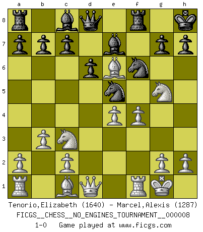 Last move : 1-0 2008 July 8 0:8:0 [Event "FICGS__CHESS__NO_ENGINES_TOURNAMENT__000008"] [Site "FICGS"] [Date "2008.05.16"] [Round "1"] [White "Tenorio,Elizabeth"] [Black "Marcel,Alexis"] [Result "1-0"] [WhiteElo "1640"] [BlackElo "1287"] 1.Nf3 f5 2.d3 Nf6 3.Nc3 e6 4.e4 fxe4 5.dxe4 Be7 6.Bc4 O-O 7.O-O d6 8.b3 Nc6 9.Ng5 Kh8 10.Bxe6 Ne5 11.f4 1-0 Reti v Dutch Kingside Castling by player Black (move 6) Kingside Castling by player White (move 7) Player White won this chess game. Follow this game move after move (download)Chess holds its master in its own bonds, shackling the mind and brain so that the inner freedom of the very strongest must suffer. (Albert Einstein) Die unerbitterlichsten Regeln im Schach sind die Ausnahmen. (Savielly Grigorievitsch Tartakower) La maestría del Ajedrez consiste esencialmente en analizar posiciónes de Ajedrez con precisión. (Mikhail Botvinnik) Tout change constamment, y compris dans le monde des Echecs. (Botvinnik) I can't decide which is riskier; taking crazy risks, or taking advice on crazy risks from a crazy risk taker. (Gregory House in House M.D.)