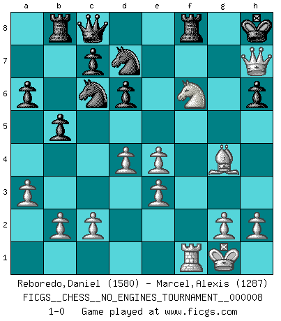 Last move : 1-0 2008 June 13 23:2:4 [Event "FICGS__CHESS__NO_ENGINES_TOURNAMENT__000008"] [Site "FICGS"] [Date "2008.05.16"] [Round "1"] [White "Reboredo,Daniel"] [Black "Marcel,Alexis"] [Result "1-0"] [WhiteElo "1580"] [BlackElo "1287"] 1.e4 e5 2.Nf3 Nf6 3.Nxe5 d6 4.Nf3 Be7 5.Nc3 O-O 6.d4 Bg4 7.Qd3 Nc6 8.Be2 Bxf3 9.Bxf3 Nb4 10.Qe2 Re8 11.Be3 Nd7 12.O-O Bg5 13.a3 Bxe3 14.fxe3 Nc6 15.Qb5 Qc8 16.Bg4 Rb8 17.Qf5 Rd8 18.Qxf7+ Kh8 19.Rf2 a6 20.Raf1 h6 21.Nd5 b5 22.Rf6 gxf6 23.Nxf6 Rf8 24.Qh7+ 1-0 Comment by player 1 : Daniel Reboredo : checkmate !! Petrov's defense Kingside Castling by player Black (move 5) Kingside Castling by player White (move 12) Player White won this chess game. Follow this game move after move (download)Some sacrifices are sound; the rest are mine. (Mikhail Tal) Dein Körper muss in Topform sein. Dein Schach verfällt, wenn dein Körper verfällt. Der Körper kann nicht vom Geist getrennt werden. (Robert James Fischer) La belleza de un movimiento no se refleja solo en su apariencia, sino en el pensamiento detrás de él. (Siegbert Tarrasch) Un journaliste : 'Vous préférez avoir une dame de plus sur l'échiquier ou au lit ?' Boris Spassky : 'Ca dépend de la position.' . 'gn is not allowed in chess unless n is an integer between 1 and 8 inclusive, where 1 and 8 are to interpreted as the standard numerals standing for integers in the ordered real-closed field R, with the *canonical* ordering. (As opposed to, say, an integer in the domain Z[2+i*sqrt(5)] or an integer in some exotic Grothendieck topos). (Normajean Yates)