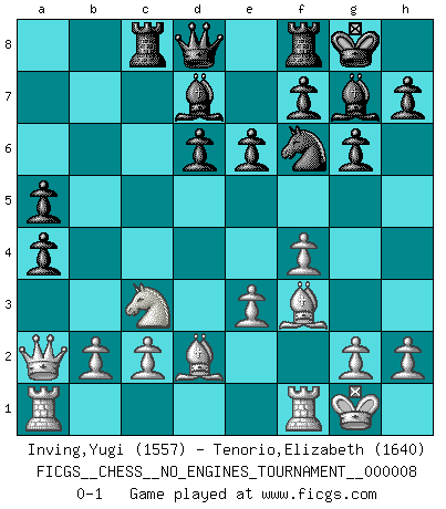 Last move : 0-1 2008 October 15 23:32:35 [Event "FICGS__CHESS__NO_ENGINES_TOURNAMENT__000008"] [Site "FICGS"] [Date "2008.05.16"] [Round "1"] [White "Inving,Yugi"] [Black "Tenorio,Elizabeth"] [Result "0-1"] [WhiteElo "1557"] [BlackElo "1640"] 1.f4 Nf6 2.e3 d6 3.Nc3 g6 4.Nf3 Bg7 5.Be2 c5 6.O-O Nc6 7.d4 cxd4 8.Nxd4 a6 9.Bf3 Bd7 10.Qd3 Rc8 11.Bd2 Nxd4 12.Qxd4 O-O 13.Qb4 b5 14.a4 a5 15.Qb3 bxa4 16.Qa2 e6 0-1 This chess game has been lost on time (started : 2008.05.16 23:49:14) Bird's Opening Kingside Castling by player White (move 6) Kingside Castling by player Black (move 12) Player Black won this chess game. Follow this game move after move (download)The mistakes are there, waiting to be made. (Savielly Tartakower) Sitze auf Deine Hände. (Siegbert Tarrasch) El Ajedrez es un invernadero donde los frutos del carácter pueden madurar mas completamente que en la vida. (Edward Morgan Foster) La tactique, c'est ce que vous faites quand il y a quelque chose à faire; la stratégie, c'est ce que vous faites quand il n'y a rien à faire. (Savielli Tartacower) At last I discovered the true beauty of chess. So I proposed to her. (Dinesh De Silva)