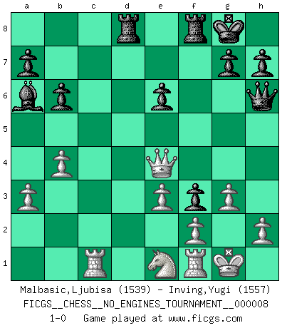 Last move : 1-0 2008 October 11 23:18:20 [Event "FICGS__CHESS__NO_ENGINES_TOURNAMENT__000008"] [Site "FICGS"] [Date "2008.05.16"] [Round "1"] [White "Malbasic,Ljubisa"] [Black "Inving,Yugi"] [Result "1-0"] [WhiteElo "1539"] [BlackElo "1557"] 1.d4 f5 2.Nf3 Nf6 3.e3 e6 4.Nbd2 Nc6 5.c4 Be7 6.Be2 O-O 7.O-O b6 8.a3 Bb7 9.b3 Qe8 10.Bb2 Qh5 11.Rc1 Qh6 12.Ne1 Ne4 13.Nxe4 fxe4 14.d5 Bd6 15.g3 Ne7 16.dxe6 dxe6 17.b4 Ng6 18.c5 Be5 19.Bxe5 Nxe5 20.Ng2 Rad8 21.Qc2 Nf3+ 22.Bxf3 exf3 23.Ne1 Ba6 24.cxb6 cxb6 25.Qe4 1-0 Dutch Kingside Castling by player Black (move 6) Kingside Castling by player White (move 7) Player White won this chess game. Follow this game move after move (download)You must take your opponent into a deep dark forest where 2+2=5, and the path leading out is only wide enough for one. (Mikhail Tal) Ich tröste mich mit dem Vergnügen, daß Schachfans, Zuschauer und Leser glücklich sind, wenn ein Großmeister etwas riskiert, statt nur Klötzchen zu schieben. (Mikhail Nekhemyevich Tal) La caracteristica mas importante en la posición del Ajedrez es la actividad de las piezas. Esto es absolutamente fundamental en todas las fases del juego: Apertura, Juego Medio y especialmente Finales. La limitación primordial en la actividad de una pieza, es la estructuración de los Peones. (Michael Stean) Il n'y a pas de prix trop élevé au scalp de l'ennemi. (Koblentz) Art disturbs, science reassures. (Georges Braque, Le Jour et la Nuit)