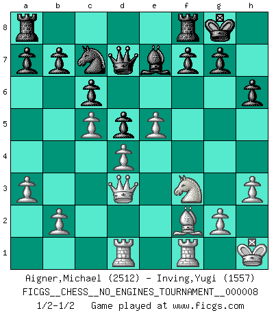 Last move : 1/2-1/2 2008 July 15 15:7:6 [Event "FICGS__CHESS__NO_ENGINES_TOURNAMENT__000008"] [Site "FICGS"] [Date "2008.05.16"] [Round "1"] [White "Aigner,Michael"] [Black "Inving,Yugi"] [Result "1/2-1/2"] [WhiteElo "2512"] [BlackElo "1557"] 1.e4 c6 2.d4 d5 3.f3 dxe4 4.fxe4 Nf6 5.e5 Nd5 6.c4 Nb6 7.Nc3 Bf5 8.Nf3 Na6 9.Bd3 Bxd3 10.Qxd3 e6 11.O-O h6 12.Be3 Be7 13.Rad1 O-O 14.a3 Qc7 15.c5 Nd5 16.Nxd5 exd5 17.Kh1 Qd7 18.h3 Nc7 19.Bf2 1/2-1/2 Caro-Kann : Tartakower (fantasy) variation Kingside Castling by player White (move 11) Kingside Castling by player Black (move 13) This chess game ended in a draw. Follow this game move after move (download)I know people who have all the will in the world, but still can't play good Chess. (Bobby Fischer) Ich habe die besten Aussichten, den ersten Preis zu gewinnen - denn jeder muss gegen Steinitz spielen, nur ich nicht! (Wilhelm Steinitz) Aquel que toma al Peón de Caballo de la Reina, se pasará la noche a dormir en la calle. (Anónimo) On n'a jamais que l'âge auquel on a commence à jouer aux échecs car après on cesse de vieillir. (Capablanca) The worth of a book is to be measured by what you can carry away from it. (James Bryce)