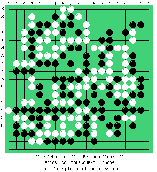 Last move : 1-0 2006 October 13 14:52:21 [Event "FICGS__GO__TOURNAMENT__000006"] [Site "FICGS"] [Date "2006.07.18"] [Round "1"] [Black "Ilie,Sebastian"] [White "Brisson,Claude"] [Result "1-0"] 1.q16 d4 2.r4 d17 3.p3 r10 4.r8 q14 5.o16 r16 6.r17 r15 7.s17 c15 8.r12 q12 9.r11 q11 10.s10 r9 11.s9 q8 12.q7 r7 13.s8 p8 14.p7 o7 15.o8 p6 16.q6 q5 17.r6 r5 18.s6 o5 19.n7 o6 20.o9 o3 21.p4 q10 22.p10 q9 23.r13 o12 24.n12 o13 25.n13 n14 26.n15 m14 27.o14 n11 28.l13 m11 29.l12 o11 30.m8 l10 31.k10 l9 32.k7 k9 33.j10 j9 34.h10 j7 35.j6 l6 36.l7 k6 37.m6 m5 38.l5 k5 39.n5 m4 40.o4 l15 41.l4 k11 42.l11 n9 43.m9 m10 44.j12 m3 45.l3 k4 46.k3 h5 47.h6 h7 48.g6 j3 49.j2 h3 50.h2 g3 51.j4 j5 52.g5 h4 53.m2 g7 54.e6 d7 55.f7 g9 56.h9 g8 57.j8 k8 58.h8 p14 59.o15 o10 60.p5 p9 61.n6 q13 62.g2 f3 63.d6 c7 64.e8 d9 65.e9 d10 66.g10 l17 67.k16 l16 68.h16 h18 69.j18 k18 70.j17 j19 71.g18 g17 72.h17 h19 73.f17 g16 74.g15 f16 75.e16 f15 76.f14 e15 77.d15 e14 78.d14 e13 79.d16 c16 80.e17 d18 81.d13 d12 82.e12 f13 83.f12 g13 84.d11 c12 85.c11 b12 86.b11 c14 87.g12 h14 88.h13 g14 89.j14 h15 90.c6 j15 91.k14 k15 92.c3 c4 93.d3 e3 94.b4 b5 95.b3 c5 96.b6 f5 97.e5 a6 98.e4 f4 99.f6 d2 100.f2 e2 101.d5 1-0 Here are the names of the openings (joseki) played in the four corners : Corner q16 : q16 q14 Hoshi (Hwajeom, Seongjeom, Xingwei`) 4-4 Point. The star or hoshi (4-4) point, emphasizing influence at the potential expense of territory. Ikken Takagakari (Hankan Nop'dakeolch'im, Yi Gaojia, 1-Space High Approach). Black typically responds at 6-4 or 3-10. Black 4-10 is played when Black finds play on the right side advantageous. Black 4-8 or 3-8 may be played when Black has support at top. Player Black won this Go (weiqi, baduk) game. Follow this game move after move (download)If you don't know ladders, don't play go. (Anonymous) Mandala - that's it! 16x16 squares as multiple of the four and the eight because of the Four Noble Truths and the Noble Eightfold Path. (Heinz-Georg Lehnhoff about Big Chess)