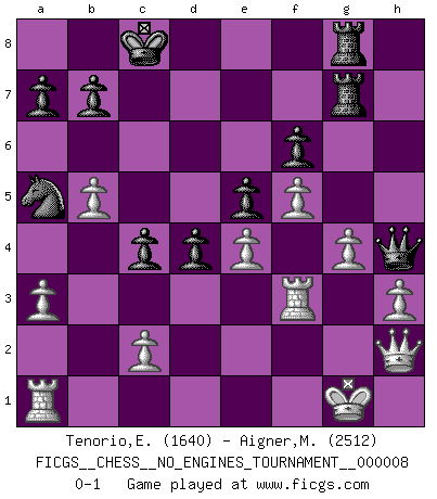 Last move : 0-1 2008 September 26 22:26:16 [Event "FICGS__CHESS__NO_ENGINES_TOURNAMENT__000008"] [Site "FICGS"] [Date "2008.05.16"] [Round "1"] [White "Tenorio,Elizabeth"] [Black "Aigner,Michael"] [Result "0-1"] [WhiteElo "1640"] [BlackElo "2512"] 1.Nf3 c5 2.d3 Nc6 3.Nc3 d5 4.e4 d4 5.Nd5 e6 6.Nf4 Nf6 7.Be2 h6 8.O-O g5 9.Nxg5 hxg5 10.Nh3 g4 11.Bxg4 e5 12.f3 Be7 13.Bxc8 Qxc8 14.Bg5 Qd7 15.f4 O-O-O 16.f5 Rdg8 17.a3 Nxe4 18.dxe4 Bxg5 19.Nxg5 Rxg5 20.Rf3 f6 21.Qe2 Qh7 22.h3 Rhg8 23.g4 Qh4 24.Qh2 R5g7 25.b4 c4 26.b5 Na5 0-1 This chess game has been lost on time (started : 2008.05.16 23:49:14) Reti Opening Kingside Castling by player White (move 8) Queenside Castling by player Black (move 15) Player Black won this chess game. Follow this game move after move (download)A passed Pawn increases in strength as the number of pieces on the board diminishes. (Capablanca) Gott hat gewollt, dass ich Champion werde. (Surab Azmajparaschvili) Aquellos que dicen entender al Ajedrez, no entienden nada. (Robert Hubner) A chaque perte on perd un peu de soi. (Joël Lautier) I have opinions of my own - strong opinions - but I don't always agree with them. (George Bush)