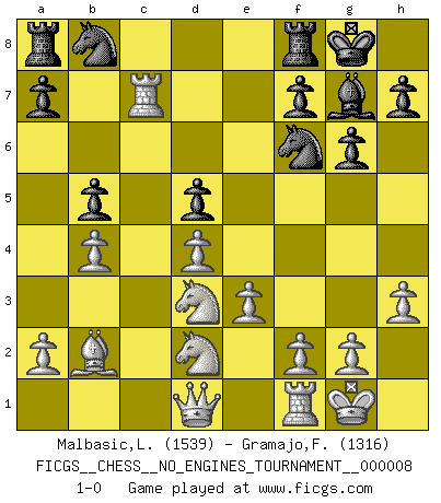 Last move : 1-0 2008 June 5 16:54:23 [Event "FICGS__CHESS__NO_ENGINES_TOURNAMENT__000008"] [Site "FICGS"] [Date "2008.05.16"] [Round "1"] [White "Malbasic,Ljubisa"] [Black "Gramajo,Francisco"] [Result "1-0"] [WhiteElo "1539"] [BlackElo "1316"] 1.d4 d5 2.e3 Bf5 3.Nd2 Nf6 4.Ngf3 g6 5.c4 Bg7 6.b3 O-O 7.Bb2 Nbd7 8.Be2 c6 9.O-O b6 10.Rc1 e6 11.h3 Qc7 12.cxd5 exd5 13.b4 b5 14.Bxb5 Nb8 15.Ne5 cxb5 16.Rxc7 Bd3 17.Nxd3 1-0 Queen's pawn game Kingside Castling by player Black (move 6) Kingside Castling by player White (move 9) Player White won this chess game. Follow this game move after move (download)After a bad opening, there is hope for the middle game. After a bad middle game, there is hope for the endgame. But once you are in the endgame, the moment of truth has arrived. (Edmar Mednis) Die Auseinandersetzung mit Karpow war politisch geprägt. Er stand für das kommunistische System, wurde von dessen Repräsentanten gehätschelt. Ich war der Oppositionelle. Jeder Schachweltmeister spiegelt auch die gesellschaftlichen Verhältnisse wider. Kramnik steht für die Börsen-Generation des Neuen Markts, ideologiefrei, zahlenfixiert. (Garry Kasparov) El Ajedrez es parte de la cultura, y si una cultura esta en decadencia, entonces también el Ajedrez declinará. (Mikhail Botvinnik) Les Echecs mettent en conflit, non pas deux intelligences, mais deux volontés. (Lasker) Cactus - It is depressed cucumber. (Ilmars Cirulis)