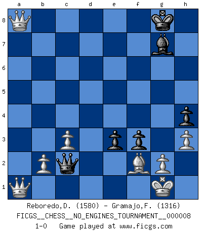 Last move : 1-0 2008 August 27 0:11:25 [Event "FICGS__CHESS__NO_ENGINES_TOURNAMENT__000008"] [Site "FICGS"] [Date "2008.05.16"] [Round "1"] [White "Reboredo,Daniel"] [Black "Gramajo,Francisco"] [Result "1-0"] [WhiteElo "1580"] [BlackElo "1316"] 1.e4 e5 2.Nf3 d6 3.d4 Bg4 4.dxe5 Nc6 5.exd6 cxd6 6.Bc4 Ne5 7.Bb5+ Bd7 8.Bxd7+ Nxd7 9.O-O Ngf6 10.Nc3 a6 11.Bg5 g6 12.Nd5 Bg7 13.Qd4 O-O 14.Nxf6+ Nxf6 15.c3 Qe7 16.Rfe1 b5 17.Rad1 Rad8 18.Qb6 h6 19.Bh4 g5 20.Bg3 Nxe4 21.Nd2 d5 22.Nxe4 dxe4 23.Qxa6 Rxd1 24.Rxd1 Rd8 25.Rxd8+ Qxd8 26.Qxb5 Qd1+ 27.Qf1 Qc2 28.Qa1 h5 29.h3 h4 30.Bc7 f5 31.a4 f4 32.Bb6 f3 33.a5 g4 34.a6 g3 35.a7 gxf2+ 36.Bxf2 e3 37.a8Q+ 1-0 Philidor's defense Kingside Castling by player White (move 9) Kingside Castling by player Black (move 13) Promotion Queen by player White (move 37) Player White won this chess game. Follow this game move after move (download)A Chess game is divided into three stages: the first, when you hope you have the advantage, the second when you believe you have an advantage, and the third... when you know you're going to lose ! (Savielly Tartakower) In der Schule lernt man nichts. Es ist nur Zeitverschwendung. (Robert James Fischer) Algunos sacrificios son sólidos, los demás son míos. (Mikhail Tal) Les échecs sont utiles à l'exercice de la faculté de penser et à celle de l'imagination. Car nous devons posséder une méthode élaborée pour atteindre des buts partout où nous devons conduire notre raison. (Leibnitz) Luck is the residue of design. (John Milton)