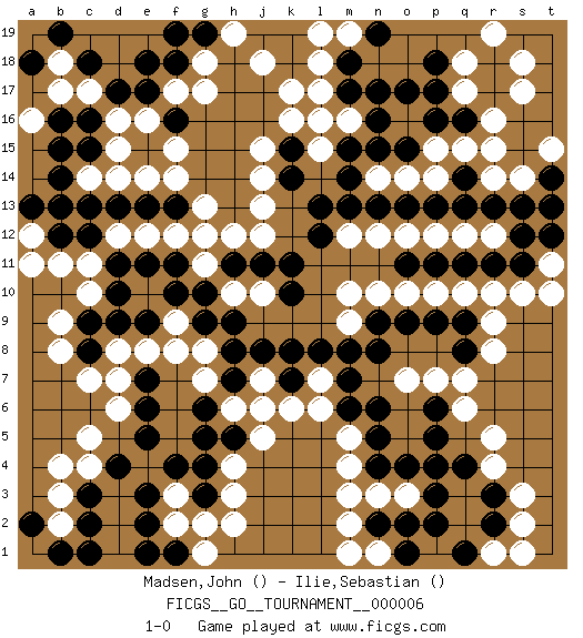 Last move : 1-0 2007 May 16 15:25:45 [Event "FICGS__GO__TOURNAMENT__000006"] [Site "FICGS"] [Date "2006.07.18"] [Round "1"] [Black "Madsen,John"] [White "Ilie,Sebastian"] [Result "1-0"] 1.d17 c4 2.q16 r4 3.c15 k17 4.n17 g17 5.e3 h3 6.e5 d6 7.e6 d7 8.g4 h4 9.g5 j6 10.c2 c11 11.p3 n3 12.p5 q6 13.p6 q7 14.n4 m4 15.n5 o3 16.p4 m5 17.m6 l6 18.m7 l7 19.m8 q10 20.h5 j5 21.r13 b2 22.c3 b3 23.d4 c5 24.r2 f2 25.e2 f3 26.f4 s2 27.r3 s3 28.q4 r5 29.s11 s10 30.r11 r10 31.p2 m2 32.c13 p7 33.l8 o7 34.n6 n10 35.n9 m10 36.o9 o10 37.p9 p10 38.k8 j10 39.h8 g7 40.h7 h6 41.g6 g8 42.h9 h10 43.g9 e8 44.g10 g11 45.f11 f12 46.e11 e12 47.d11 d12 48.d9 f9 49.f10 c10 50.d10 b8 51.e9 f8 52.l16 r15 53.q14 r16 54.r17 q15 55.p16 p15 56.o13 s17 57.r18 s18 58.o15 p14 59.p13 o14 60.n13 n14 61.m14 o16 62.o17 q17 63.p17 q18 64.p18 r19 65.l13 m12 66.m13 l17 67.m17 l15 68.m15 k16 69.n15 q12 70.q13 r12 71.s12 s14 72.q11 p12 73.p11 o12 74.s13 d14 75.l12 n12 76.k10 j13 77.f16 f17 78.e17 c14 79.b14 d15 80.c16 e16 81.h11 g12 82.k14 j14 83.d13 f15 84.e13 f14 85.j11 j12 86.m18 l18 87.c8 c7 88.b12 h12 89.k11 b11 90.q9 r9 91.g3 g2 92.k15 j15 93.f1 h2 94.f13 g13 95.f18 g18 96.e18 r1 97.q1 s1 98.q8 r8 99.k7 k6 100.g19 h19 101.f19 j18 102.b1 m16 103.c9 b9 104.o2 l16 105.n16 d16 106.c12 c17 107.c18 b17 108.b16 a16 109.b15 b18 110.b19 a12 111.a13 a11 112.a18 e14 113.b13 m9 114.n8 j7 115.j8 g1 116.e1 m19 117.n19 l19 118.e7 d8 119.c1 t11 120.t12 t10 121.n2 n1 122.o1 m1 123.t14 t15 124.t13 r14 125.o4 m3 126.a2 b4 127.o11 1-0 This go game has been lost on time (started : 2006.07.18 8:34:59) Here are the names of the openings (joseki) played in the four corners : Corner d4 : c4 e3 Komoku (Somok, Xiao~mu`) 3-4 Point. The komoku (3-4) point is the traditional corner enclosure move.. Ikken Kakari (Hankan Keolch'im, Yi Gua`jiao~, 1-Space Low Pincer). The small knight move is the basic approach move to the 3-4 point stone. It has been continually used for over four centuries. There are limitless variations, with new moves constantly being discovered. Black 2 opens the door to a treaure store of joseki. Corner q4 : r4 p3 Komoku (Somok, Xiao~mu`) 3-4 Point. The komoku (3-4) point is the traditional corner enclosure move.. Ikken Kakari (Hankan Keolch'im, Yi Gua`jiao~, 1-Space Low Pincer). The small knight move is the basic approach move to the 3-4 point stone. It has been continually used for over four centuries. There are limitless variations, with new moves constantly being discovered. Black 2 opens the door to a treaure store of joseki. Player Black won this Go (weiqi, baduk) game. Follow this game move after move (download)When your opponent has two weak groups, attack them both at once. (Anonymous) It's only after you lost everything, Tyler says, that you're free to do anything. (Chuck Palahniuk, Fight Club)
