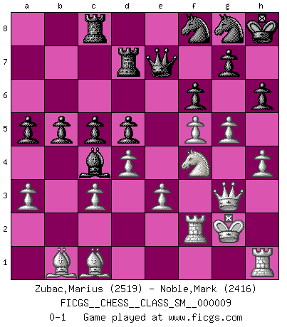 Last move : 0-1 2008 December 5 7:1:47 [Event "FICGS__CHESS__CLASS_SM__000009"] [Site "FICGS"] [Date "2008.05.17"] [Round "1"] [White "Zubac,Marius"] [Black "Noble,Mark"] [Result "0-1"] [WhiteElo "2519"] [BlackElo "2416"] 1.d4 Nf6 2.c4 e6 3.Nc3 Bb4 4.f3 d5 5.a3 Bxc3+ 6.bxc3 c5 7.cxd5 exd5 8.e3 Qc7 9.Ra2 O-O 10.Bd3 b6 11.Ne2 Ba6 12.Bb1 Re8 13.O-O Nc6 14.Re1 Rad8 15.g4 Bc4 16.Rb2 h6 17.Ng3 Nh7 18.Kg2 Nf8 19.h4 Ne7 20.g5 Qd6 21.Rh1 Kh8 22.f4 Ng8 23.f5 f6 24.Qg4 Qe7 25.Nh5 Rd7 26.Qg3 Rc8 27.Nf4 b5 28.Rf2 a5 0-1 This chess game has been lost on time (started : 2008.05.17 20:20:49) Nimzo-Indian : Kmoch variation Kingside Castling by player Black (move 9) Kingside Castling by player White (move 13) Player Black won this chess game. Follow this game move after move (download)What is the object of playing a gambit opening?... To acquire a reputation of being a dashing player at the cost of losing a game. (Siegbert Tarrasch) Im Spitzenschach von heute geht es nur um Vorbereitung, um tiefgründige, sorgfältige Eröffnungsvorbereitung. (Nigel Short) El Ajedrez es un invernadero donde los frutos del carácter pueden madurar mas completamente que en la vida. (Edward Morgan Foster) La tactique est l'élément le plus important du milieu de jeu. (Siegbert Tarrasch) Perhaps the current trend of many chess professionals taking up the more lucrative pastime of poker is not a wholly negative one. It may not be too late for humans to relearn how to take risks in order to innovate and thereby maintain the advanced lifestyles we enjoy. And if it takes a poker-playing supercomputer to remind us that we can't enjoy the rewards without taking the risks, so be it. (The Chess Master and the Computer, by Garry Kasparov - 2010)