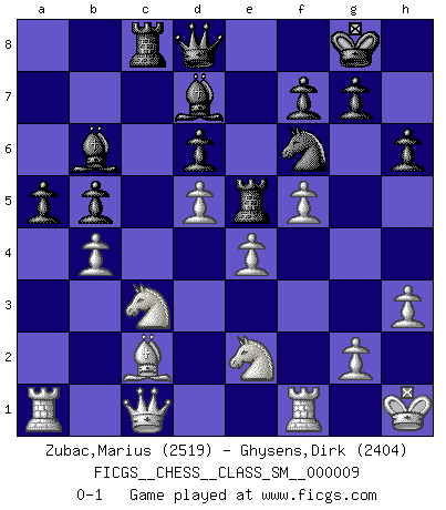Last move : 0-1 2008 October 5 14:38:8 [Event "FICGS__CHESS__CLASS_SM__000009"] [Site "FICGS"] [Date "2008.05.17"] [Round "1"] [White "Zubac,Marius"] [Black "Ghysens,Dirk"] [Result "0-1"] [WhiteElo "2519"] [BlackElo "2404"] 1.d4 Nf6 2.c4 e6 3.Nc3 Bb4 4.f3 c5 5.d5 exd5 6.cxd5 d6 7.e4 O-O 8.Bd3 Nbd7 9.Nge2 Ne5 10.Bc2 Re8 11.O-O Bd7 12.Bg5 h6 13.Bh4 a6 14.Qc1 b5 15.a3 Ba5 16.Kh1 Rb8 17.h3 Bb6 18.b4 Rc8 19.f4 Ng6 20.Bg3 cxb4 21.axb4 a5 22.f5 Ne5 23.Bxe5 Rxe5 0-1 This chess game has been lost on time (started : 2008.05.17 20:20:49) Nimzo-Indian : Kmoch variation Kingside Castling by player Black (move 7) Kingside Castling by player White (move 11) Player Black won this chess game. Follow this game move after move (download)It began to feel as though you were playing against Chess itself. - On playing against Robert Fischer. (Walter Shipman) Ein typischer, sehr verbreiteter Gedankenschädling ist der, daß der betreffende Amateur von der Annanhme ausgeht, daß jeder einzelne Zug etwas zu leisten habe. (Aaron Nimzowitsch) El Ajedrez es un cuento de Hadas de las 1001 metidas de pata. (Savielly Tartakower) Il s'avisa de me proposer d'apprendre les échecs qu'il jouait un peu... me voilà forcené des échecs. J'achète un échiquier, je m'enferme dans ma chambre, j'y passe des jours et des nuits à vouloir apprendre par cur toutes les parties. (Jean-Jacques Rousseau, Confessions) Experiences are the keys to life. (Daniel Parmet)