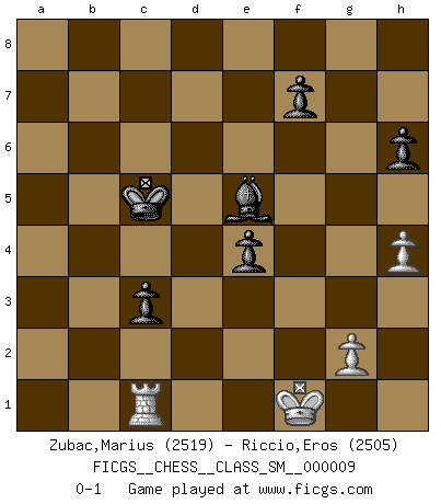 Last move : 0-1 2009 January 21 7:28:6 [Event "FICGS__CHESS__CLASS_SM__000009"] [Site "FICGS"] [Date "2008.05.17"] [Round "1"] [White "Zubac,Marius"] [Black "Riccio,Eros"] [Result "0-1"] [WhiteElo "2519"] [BlackElo "2505"] 1.d4 d5 2.c4 c6 3.Nc3 Nf6 4.Nf3 e6 5.Bg5 h6 6.Bh4 dxc4 7.e4 g5 8.Bg3 b5 9.Be2 Bb7 10.h4 g4 11.Ne5 Nbd7 12.Nxd7 Qxd7 13.Be5 Qe7 14.Bxg4 Rg8 15.Bf3 O-O-O 16.Qe2 Nd7 17.Bg3 e5 18.O-O-O Bg7 19.d5 Nc5 20.Kb1 b4 21.dxc6 bxc3 22.cxb7+ Qxb7 23.Ka1 cxb2+ 24.Qxb2 Qxb2+ 25.Kxb2 Nd3+ 26.Kc2 Rd4 27.Rb1 Rgd8 28.Rb5 a6 29.Ra5 Kc7 30.Rb1 R8d6 31.Kc3 Rb6 32.Rg1 Rb5 33.Rxb5 axb5 34.Rd1 Kc6 35.Be2 Nc5 36.f3 Rxe4 37.fxe4 Nxe4+ 38.Kc2 Nxg3 39.Bf1 e4 40.a4 Kc5 41.axb5 Kxb5 42.Kd2 Be5 43.Ke1 Kb4 44.Rb1+ Kc5 45.Rc1 Nxf1 46.Kxf1 c3 0-1 This chess game has been lost on time (started : 2008.05.17 20:20:49) QGD Slav defense Queenside Castling by player Black (move 15) Queenside Castling by player White (move 18) 10 pieces endgame at move 46 : White KRPP , Black KBPPPP WHITE : King + 1 Rook 2 Pawns BLACK : King + 1 Bishop 4 Pawns Player Black won this chess game. Follow this game move after move (download)An attack on the wing should be met by play in the center. (Nimzovitch) Ivan Sokolov treibt mich als Beifahrer an mit go Loeky go - . (Loek van Wely) Un entendimiento minucioso de las típicas continuaciones de mate hacen de las mas complicadas combinaciones de sacrificio que conducen hacia ellas no solo no dificiles, sino casi un asunto de rutina. (Siegbert Tarrasch) Un journaliste : 'Vous préférez avoir une dame de plus sur l'échiquier ou au lit ?' Boris Spassky : 'Ca dépend de la position.' A good teacher is like a candle - it consumes itself to light the way for others. (Author unknown)