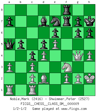Last move : 1/2-1/2 2008 June 14 17:21:23 [Event "FICGS__CHESS__CLASS_SM__000009"] [Site "FICGS"] [Date "2008.05.17"] [Round "1"] [White "Noble,Mark"] [Black "Shwimmer,Peter"] [Result "1/2-1/2"] [WhiteElo "2416"] [BlackElo "2527"] 1.e4 e6 2.d4 d5 3.Nc3 Bb4 4.e5 Ne7 5.a3 Bxc3+ 6.bxc3 c5 7.Qg4 O-O 8.Bd3 c4 9.Bh6 Ng6 10.Bxg6 fxg6 11.Bd2 Nc6 12.Nf3 Bd7 13.O-O b5 14.h4 Rf5 15.Qh3 Qa5 16.Rfb1 Raf8 17.Rd1 Qa4 18.Rdc1 h6 19.Qg4 Ne7 20.Ra2 R5f7 21.Kh2 Qa5 22.R2a1 Kh7 1/2-1/2 French : Winawer, Advance variation Kingside Castling by player Black (move 7) Kingside Castling by player White (move 13) This chess game ended in a draw. Follow this game move after move (download)Half the variations which are calculated in a tournament game turn out to be completely superfluous. Unfortunately, no one knows in advance which half. (Jan Tinman) Ein Schachgenie ist jemand der verdammt gut Schach spielt. (Jonathan Levitt) ¿Se han dado cuenta de que Fischer casi nunca ha tenido piezas malas? El las intercambia y las piezas malas se quedan con sus oponenets. (Yuri Balashov) Pour moi, les échecs ne sont pas un jeu mais un art. (Alexandre Alekhine) When you have everything, sometimes it feels like nothing. (Horatio Caine, C.S.I. Miami)