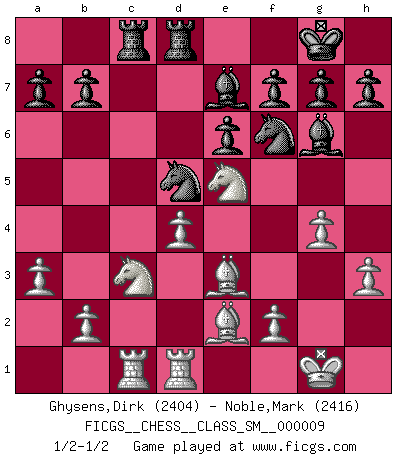 Last move : 1/2-1/2 2008 June 14 3:18:31 [Event "FICGS__CHESS__CLASS_SM__000009"] [Site "FICGS"] [Date "2008.05.17"] [Round "1"] [White "Ghysens,Dirk"] [Black "Noble,Mark"] [Result "1/2-1/2"] [WhiteElo "2404"] [BlackElo "2416"] 1.e4 c5 2.c3 d5 3.exd5 Qxd5 4.d4 Nf6 5.Nf3 Bg4 6.Be2 e6 7.O-O Nc6 8.h3 Bh5 9.Be3 cxd4 10.cxd4 Be7 11.Nc3 Qd6 12.Qb3 O-O 13.Rfd1 Rfd8 14.Rac1 Qb4 15.Qxb4 Nxb4 16.g4 Bg6 17.Ne5 Rac8 18.a3 Nbd5 1/2-1/2 Sicilian : Alapin's variation (2.c3) Kingside Castling by player White (move 7) Kingside Castling by player Black (move 12) This chess game ended in a draw. Follow this game move after move (download)Even the laziest King flees wildly in the face of a double check ! (Aaron Nimzowitsch) Man gibt nur Pakete auf. (Paul Keres) Aquellos que dicen que entienden al Ajedrez, no entienden nada. (Robert Hubner) Ce qui caractérise les parties de combat, c'est que si le défenseur a constamment de difficiles problèmes à résoudre, l'attaquant doit chercher sans relâche de nouvelles possibilités d'attaque. (Koblentz) Once you start thinking you have nothing left to learn, you have everything to learn. (Steve Badget)