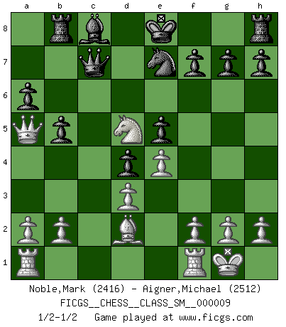 Last move : 1/2-1/2 2008 July 17 10:21:48 [Event "FICGS__CHESS__CLASS_SM__000009"] [Site "FICGS"] [Date "2008.05.17"] [Round "1"] [White "Noble,Mark"] [Black "Aigner,Michael"] [Result "1/2-1/2"] [WhiteElo "2416"] [BlackElo "2512"] 1.e4 c5 2.Nf3 Nc6 3.d4 cxd4 4.Nxd4 e5 5.Nb5 a6 6.Nd6+ Bxd6 7.Qxd6 Qf6 8.Qc7 Nge7 9.Nc3 Nb4 10.Bd3 d5 11.O-O d4 12.Na4 Qc6 13.Qa5 Nxd3 14.cxd3 b5 15.Nb6 Qc7 16.Bd2 Rb8 17.Nd5 1/2-1/2 Sicilian : Labourdonnais-Loewenthal variation Kingside Castling by player White (move 11) This chess game ended in a draw. Follow this game move after move (download)Bobby Fischer is the greatest Chess player who has ever lived. (Ken Smith) Das Schachspiel hat wie die Liebe, die Musik, die Fähigkeit, den Menschen glücklich zu machen. Ich habe ein leises Gefühl des Bedauerns für jeden, der das Schachspiel nicht kennt, so wie ich jeden bedaure, der die Liebe nicht kennt. (Siegbert Tarrasch) El Ajedrez es un regaderazo frío para la mente. (Sir John Simon) Les Cavaliers se révèlent fort utiles dans les positions fermées. D'habitude, les Fous sont un peu plus forts que les Cavaliers dans les positions ouvertes. Qu'on le veuille ou non, il restera toujours des exceptions ! Train yourself to let go of everything you fear to lose. (Master Yoda in Star Wars ep.3)