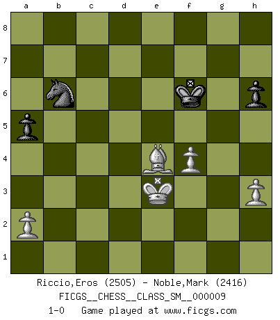 Last move : 1-0 2008 October 2 17:40:30 [Event "FICGS__CHESS__CLASS_SM__000009"] [Site "FICGS"] [Date "2008.05.17"] [Round "1"] [White "Riccio,Eros"] [Black "Noble,Mark"] [Result "1-0"] [WhiteElo "2505"] [BlackElo "2416"] 1.e4 c5 2.Nf3 Nc6 3.d4 cxd4 4.Nxd4 Nf6 5.Nc3 e5 6.Ndb5 d6 7.Bg5 a6 8.Na3 b5 9.Bxf6 gxf6 10.Nd5 f5 11.Bd3 Be6 12.O-O Bxd5 13.exd5 Ne7 14.Nxb5 Bg7 15.Nc3 e4 16.Bc4 Ng6 17.Qh5 Bxc3 18.bxc3 Qf6 19.Qh6 Rg8 20.Rab1 Qxc3 21.Be2 Qg7 22.Qxg7 Rxg7 23.f4 Kd7 24.g3 Kc7 25.Kf2 Ne7 26.c4 R7g8 27.Rfc1 Rab8 28.Bh5 Rgf8 29.Ke3 Rxb1 30.Rxb1 Ng8 31.Kd4 Nf6 32.Be2 Rg8 33.c5 dxc5+ 34.Kxc5 Rd8 35.Bc4 Nd7+ 36.Kd4 Nb6 37.Bb3 Kd6 38.Rc1 Rc8 39.Rc6+ Rxc6 40.dxc6 Kxc6 41.Bxf7 Kd6 42.Bg8 h6 43.h3 Ke7 44.g4 Kf6 45.Ke3 a5 46.gxf5 Kxf5 47.Bh7+ Kf6 48.Bxe4 1-0 Sicilian : Pelikan (Lasker/Sveshnikov) variation Kingside Castling by player White (move 12) 10 pieces endgame at move 46 : White KBPPP , Black KNPPP WHITE : King + 1 Bishop 3 Pawns BLACK : King + 1 Knight 3 Pawns 9 pieces endgame at move 48 : White KBPPP , Black KNPP WHITE : King + 1 Bishop 3 Pawns BLACK : King + 1 Knight 2 Pawns Player White won this chess game. Follow this game move after move (download)All that matters on the Chessboard is good moves. (Bobby Fischer) Es gibt zwei Arten von Opfern: Korrekte und meine. (Mikhail Nekhemyevich Tal) Todos los jugadores de Ajedrez deberían tener un pasatiempo. (Savielly Tartakower) Il (Jacob Murray) ne joue pas pour le bon coup, mais pour le meilleur. (Eloi Relange) If you don't practice you don't deserve to win. (Andre Agassi)