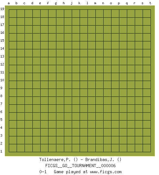 Last move : 0-1 2006 September 16 13:23:48 [Event "FICGS__GO__TOURNAMENT__000006"] [Site "FICGS"] [Date "2006.07.18"] [Round "1"] [Black "Tollenaere,Peter"] [White "Brandibas,Jerome"] [Result "0-1"] 0-1 This go game has been lost on time (started : 2006.07.18 8:34:59) Here are the names of the openings (joseki) played in the four corners : Player White won this Go (weiqi, baduk) game. Follow this game move after move (download)Strange things happen at the one-two points. (Anonymous) There are lots of people who mistake their imagination for their memory. (Josh Bilings)