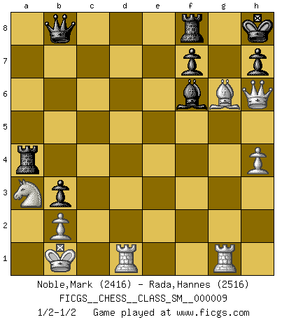 Last move : 1/2-1/2 2008 October 30 19:56:23 [Event "FICGS__CHESS__CLASS_SM__000009"] [Site "FICGS"] [Date "2008.05.17"] [Round "1"] [White "Noble,Mark"] [Black "Rada,Hannes"] [Result "1/2-1/2"] [WhiteElo "2416"] [BlackElo "2516"] 1.e4 c5 2.Nf3 d6 3.d4 cxd4 4.Nxd4 Nf6 5.Nc3 a6 6.Be3 e5 7.Nb3 Be6 8.f3 Be7 9.Qd2 O-O 10.O-O-O Nbd7 11.g4 b5 12.g5 b4 13.Ne2 Ne8 14.f4 a5 15.f5 a4 16.Nbd4 exd4 17.Nxd4 b3 18.Kb1 bxc2+ 19.Nxc2 Bb3 20.axb3 axb3 21.Na3 Ne5 22.h4 Ra4 23.Bd4 Qa8 24.Qe3 Nc7 25.f6 gxf6 26.gxf6 Bxf6 27.Rg1+ Kh8 28.Qh6 Qd8 29.Bb6 Qe7 30.Bxc7 Ng6 31.Bxd6 Qxe4+ 32.Bd3 Qd4 33.Qc1 Qxd6 34.Bxg6 Qb8 35.Qh6 1/2-1/2 Sicilian : Najdorf, Byrne (English) attack Kingside Castling by player Black (move 9) Queenside Castling by player White (move 10) This chess game ended in a draw. Follow this game move after move (download)Openings teach you openings. Endgames teach you chess ! (Stephan Gerzadowicz) Es hat in meinem Leben Zeiten gegeben, in denen das Schachspiel, wenn nicht zum Lebenszweck, so doch zu einem regelrechten Lebensersatz geworden ist. Man fühlt sich in solchen Zeiten nicht so, als besäße man eine göttliche Gabe, sondern eher so, als sei man von ihr besessen. (Garry Kasparov) Las piezas de Ajedrez son los bloques del alfabeto que moldean los pensamientos; y esos pensamientos, aunque hagan un diseño visual en el tablero, expresan abstractamente su belleza como un poema. (Marcel Duchamp) Si rien de grave n'est détecté lors de l'analyse d'une position, on joue alors le coup. Seconde règle de Blumenfeld. We cannot be sure of having something to live for unless we are willing to die for it. (Ernesto Che Guevara)