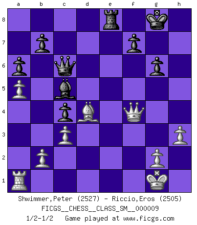 Last move : 1/2-1/2 2008 June 18 12:9:52 [Event "FICGS__CHESS__CLASS_SM__000009"] [Site "FICGS"] [Date "2008.05.17"] [Round "1"] [White "Shwimmer,Peter"] [Black "Riccio,Eros"] [Result "1/2-1/2"] [WhiteElo "2527"] [BlackElo "2505"] 1.e4 c5 2.Nc3 d6 3.f4 g6 4.Nf3 Nc6 5.Bb5 Bd7 6.O-O Bg7 7.d3 a6 8.Bxc6 Bxc6 9.Qe1 Nf6 10.a4 O-O 11.a5 e6 12.e5 dxe5 13.Nxe5 Rc8 14.Be3 Nd7 15.Nxd7 Bxd7 16.Qf2 Qc7 17.Ne4 Bc6 18.c3 Bxe4 19.dxe4 Rfd8 20.Qe2 Rd7 21.Rfd1 Rxd1+ 22.Qxd1 Bf8 23.Qb3 c4 24.Qb6 Qd7 25.Qd4 Qc6 26.h3 Be7 27.f5 exf5 28.exf5 Rd8 29.Qf4 Re8 30.fxg6 hxg6 31.Bd4 Bc5 1/2-1/2 Sicilian : Closed Kingside Castling by player White (move 6) Kingside Castling by player Black (move 10) This chess game ended in a draw. Follow this game move after move (download)If I win a tournament, I win it by myself. I do the playing. Nobody helps me. (Bobby Fischer) Wenn ich einen Club besuche, sind die Spieler stumm vor Staunen. (José Raúl Capablanca) Vive, pierde y aprende al observar a tu oponente como ganar. (Amber Steenbock) Il vaut mieux sacrifier les pièces de l'adversaire. (Xavier Tartacover) Coffee just isn't my cup of tea. (Unknown)