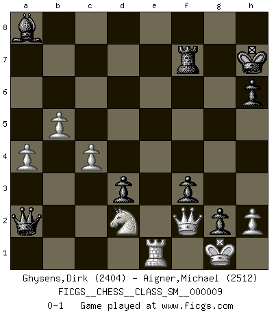 Last move : 0-1 2008 October 5 0:37:16 [Event "FICGS__CHESS__CLASS_SM__000009"] [Site "FICGS"] [Date "2008.05.17"] [Round "1"] [White "Ghysens,Dirk"] [Black "Aigner,Michael"] [Result "0-1"] [WhiteElo "2404"] [BlackElo "2512"] 1.e4 c5 2.c3 e5 3.Nf3 Nc6 4.Bc4 Nf6 5.Ng5 d5 6.exd5 Nxd5 7.Qh5 g6 8.Qf3 Qxg5 9.Bxd5 Nd8 10.O-O Qf5 11.Qe3 Be6 12.Be4 Qf6 13.Na3 Rc8 14.Re1 Bg7 15.Nb5 Qe7 16.Nxa7 Ra8 17.Nb5 O-O 18.b3 f5 19.Bc2 f4 20.Qf3 Bd7 21.Na3 Ne6 22.Qxb7 f3 23.Be4 fxg2 24.d3 Qh4 25.Be3 Rad8 26.Bd5 Bh6 27.f3 Bxe3+ 28.Rxe3 Rf5 29.Re2 Kh8 30.Bxe6 Bxe6 31.Qe4 Qf6 32.Rf2 Bd5 33.Qe3 Bxf3 34.Nc4 Rf8 35.Nd2 Bc6 36.Rxf5 gxf5 37.Nc4 e4 38.Qxc5 exd3 39.Rd1 Be4 40.Nd2 h6 41.Re1 Ba8 42.b4 f4 43.c4 f3 44.Qf2 Kh7 45.b5 Rf7 46.a3 Qb2 47.a4 Qa2 0-1 Sicilian : Alapin's variation (2.c3) Kingside Castling by player White (move 10) Kingside Castling by player Black (move 17) Player Black won this chess game. Follow this game move after move (download)White lost because he failed to remember the right continuation and had to think up the moves himself. (Siegbert Tarrasch) Kein Schachspieler kann gut schlafen. (H. G. Wells) El Ajedrez es un invernadero donde los frutos del carácter pueden madurar mas completamente que en la vida. (Edward Morgan Foster) Même si vous avez un bon coup à faire, regardez toujours s'il n'y en a pas un qui lui soit préférable. (Pedro Damiano) Warrior pose battles inner weakness and wins focus. You see that there is no war within you. You're on your own side, and you are your own strength. (Terri Guillemets)