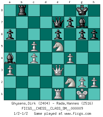 Last move : 1/2-1/2 2008 October 8 22:10:19 [Event "FICGS__CHESS__CLASS_SM__000009"] [Site "FICGS"] [Date "2008.05.17"] [Round "1"] [White "Ghysens,Dirk"] [Black "Rada,Hannes"] [Result "1/2-1/2"] [WhiteElo "2404"] [BlackElo "2516"] 1.e4 e6 2.d4 d5 3.Nc3 Nc6 4.Nf3 Nf6 5.Bd3 Bb4 6.Bg5 dxe4 7.Bxe4 h6 8.Bxf6 Qxf6 9.O-O O-O 10.a3 Bd6 11.Qd3 Bd7 12.Rfe1 a6 13.Rad1 Rab8 14.b4 g6 15.Ne2 Rfd8 16.c4 Bf8 17.Qc2 Be8 18.Qc1 Bg7 19.Qe3 Ne7 20.Ne5 Nf5 21.Bxf5 Qxf5 22.f4 Qf6 23.Nc3 Qe7 24.Ne4 b6 25.Nf2 c5 26.bxc5 bxc5 27.dxc5 Rxd1 28.Rxd1 Ba4 29.Re1 1/2-1/2 French : Paulsen variation Kingside Castling by player White (move 9) Kingside Castling by player Black (move 9) This chess game ended in a draw. Follow this game move after move (download)By playing at Chess then, we may learn: First: Foresight... Second: Circumspection... Third: Caution... And lastly, we learn by Chess the habit of not being discouraged by present bad appearances in the state of our affairs, the habit of hoping for a favorable chance, and that of persevering in the secrets of resources. (Benjamin Franklin) Charakterschwächen offenbaren sich normalerweise während einer Schachpartie. (Garry Kasparov) El Ajedrez es un cuento de Hadas de las 1001 metidas de pata. (Savielly Tartakower) Les ravages du H expliquent la différence de niveau entre Tal et Thal [Abergel]. The message for business people contemplating their place in the cyberspace is simple and direct: get linked or get lost. (Vic Sussman and Kenan Pollack)
