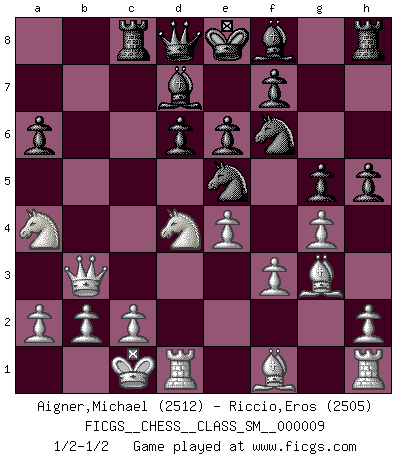 Last move : 1/2-1/2 2008 July 24 3:27:15 [Event "FICGS__CHESS__CLASS_SM__000009"] [Site "FICGS"] [Date "2008.05.17"] [Round "1"] [White "Aigner,Michael"] [Black "Riccio,Eros"] [Result "1/2-1/2"] [WhiteElo "2512"] [BlackElo "2505"] 1.e4 c5 2.Nf3 d6 3.d4 cxd4 4.Nxd4 Nf6 5.Nc3 a6 6.Be3 e6 7.f3 b5 8.Qd2 Nbd7 9.g4 b4 10.Na4 h6 11.O-O-O Ne5 12.Qxb4 Bd7 13.Bf4 g5 14.Bg3 h5 15.Qc3 Rc8 16.Qb3 Rb8 17.Qc3 Rc8 18.Qb3 1/2-1/2 Sicilian : Najdorf, Byrne (English) attack Queenside Castling by player White (move 11) This chess game ended in a draw. Follow this game move after move (download)The game of chess is the touchstone of the intellect. (Goethe) Die Elozahlen sind sehr schlecht für das Schach. Jetzt ist Schach eine Sportindustrie, die darauf zielt Elopunkte zu machen. (Miguel Najdorf) Yo tuve un dolor de muelas en la primer partida. En el segundo juego, tuve un dolor de cabeza. En el tercero, tuve un ataque de reumatísmo. En la cuarta partida, no me sentía muy bien. ¿Y en el quinto juego? Bueno, ¿que acaso uno tiene que ganar todos los juegos?. (Siegbert Tarrasch) Les échecs sont utiles à l'exercice de la faculté de penser et à celle de l'imagination. Car nous devons posséder une méthode élaborée pour atteindre des buts partout où nous devons conduire notre raison. (Leibnitz) Nobody is always a winner, and anybody who says he is, is either a liar or doesn't play poker. (Amarillo Slim)