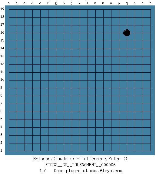 Last move : 1-0 2006 September 16 19:23:58 [Event "FICGS__GO__TOURNAMENT__000006"] [Site "FICGS"] [Date "2006.07.18"] [Round "1"] [Black "Brisson,Claude"] [White "Tollenaere,Peter"] [Result "1-0"] 1.q16 1-0 This go game has been lost on time (started : 2006.07.18 8:34:59) Here are the names of the openings (joseki) played in the four corners : Player Black won this Go (weiqi, baduk) game. Follow this game move after move (download)Keshi is worth as much as an invasion ! (Anonymous) In theory there is no difference between theory and practice. In practice there is. (Yogi Berra)