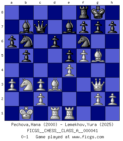 Last move : 0-1 2008 September 26 19:30:32 [Event "FICGS__CHESS__CLASS_A__000041"] [Site "FICGS"] [Date "2008.05.18"] [Round "1"] [White "Pechova,Hana"] [Black "Lemekhov,Yura"] [Result "0-1"] [WhiteElo "2000"] [BlackElo "2025"] 1.e4 c5 2.Nf3 d6 3.d4 cxd4 4.Nxd4 Nf6 5.Nc3 a6 6.Bg5 e6 7.f4 Nbd7 8.Qf3 Qc7 9.O-O-O b5 10.Bd3 Bb7 11.Rhe1 Be7 12.a3 Qb6 13.Nb3 Rc8 14.Qh3 Rxc3 15.bxc3 Qc7 16.f5 e5 17.Qg3 O-O 18.Kb1 Nb6 0-1 This chess game has been lost on time (started : 2008.05.18 10:11:30) Sicilian : Najdorf, 7.f4 Queenside Castling by player White (move 9) Kingside Castling by player Black (move 17) Player Black won this chess game. Follow this game move after move (download)At this time Fischer is simply a level above all the best Chessplayers in the world. (John Jacobs) Gott hat gewollt, dass ich Champion werde. (Surab Azmajparaschvili) Durante una competencia de Ajedrez, un Maestro de Ajedrez deberá ser una combinación de presa de caza y un Monge. (Alexander Alekhine) Des idées, des idées, j'en ai cent, j'en ai mille. Des bonnes, des mauvaises, applicables, irréalisables... Il suffit de faire le tri ! (Roos) All men can see these tactics whereby I conquer, but what none can see is the strategy out of which victory is evolved. (Sun Tzu)