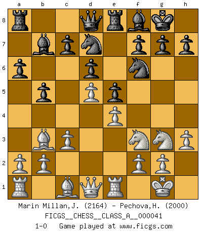 Last move : 1-0 2008 November 3 7:37:19 [Event "FICGS__CHESS__CLASS_A__000041"] [Site "FICGS"] [Date "2008.05.18"] [Round "1"] [White "Marin Millan,Jose Antonio"] [Black "Pechova,Hana"] [Result "1-0"] [WhiteElo "2164"] [BlackElo "2000"] 1.e4 e5 2.Nf3 Nc6 3.Bb5 a6 4.Ba4 Nf6 5.O-O Be7 6.Re1 b5 7.Bb3 d6 8.c3 O-O 9.h3 Bb7 10.d4 Re8 11.Nbd2 Bf8 12.d5 Nb8 13.Nf1 Nbd7 14.Ng3 1-0 This chess game has been lost on time (started : 2008.05.18 10:11:30) Ruy Lopez : Closed Kingside Castling by player White (move 5) Kingside Castling by player Black (move 8) Player White won this chess game. Follow this game move after move (download)You need not play well - just help your opponent to play badly. (Genrikh Chepukaitis) Ich hatte meine größten Erfolge, als ich 47 Jahre alt war. Kasparow war noch nicht mal 42 und hat das Schach schon im Stich gelassen. (Viktor Kortschnoi) Bobby es la celebridad menos entendida y malinterpretada que camina el la faz de esta tierra. (Yasser Seirawan) Ce qui caractérise les parties de combat, c'est que si le défenseur a constamment de difficiles problèmes à résoudre, l'attaquant doit chercher sans relâche de nouvelles possibilités d'attaque. (Koblentz) Lamb in skin of tiger, still fears the wolf. (Chinese proverb)