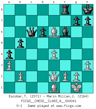 Last move : 0-1 2009 February 9 3:49:55 [Event "FICGS__CHESS__CLASS_A__000041"] [Site "FICGS"] [Date "2008.05.18"] [Round "1"] [White "Escobar,Telmo"] [Black "Marin Millan,Jose Antonio"] [Result "0-1"] [WhiteElo "2071"] [BlackElo "2164"] 1.e4 e5 2.Nf3 Nc6 3.Bb5 a6 4.Ba4 Nf6 5.O-O Be7 6.Re1 b5 7.Bb3 d6 8.c3 O-O 9.h3 Na5 10.Bc2 c5 11.d4 Qc7 12.Nbd2 cxd4 13.cxd4 Nc6 14.Nb3 a5 15.Be3 a4 16.Nbd2 Bd7 17.Rc1 Rac8 18.Bb1 Qa5 19.a3 exd4 20.Nxd4 Nxd4 21.Bxd4 Rxc1 22.Qxc1 Be6 23.Bc3 Qa6 24.Nf3 Nd7 25.Nd4 Ne5 26.Nxe6 fxe6 27.Ba2 Nd3 28.Qe3 Nxe1 29.Bxe6+ Kh8 30.Bxe1 Bf6 31.Qe2 Qc6 0-1 Ruy Lopez : Closed Kingside Castling by player White (move 5) Kingside Castling by player Black (move 8) Player Black won this chess game. Follow this game move after move (download)I have added these principles to the law: get the Knights into action before both Bishops are developed. (Emanuel Lasker) Konzentriere dich auf materielle Gewinne. Nimm, was dir dein Gegner gibt, ausser es gibt einen guten Grund der dagegenspricht. (Robert James Fischer) Los libros de Ajedrez deben de usarse igual como usamos los anteojos: para mejorar la vista, aunque algunos jugadores los quieren usar como si ellos les otorgaran la vision. (José Raúl Capablanca) On n'a jamais que l'âge auquel on a commence à jouer aux échecs car après on cesse de vieillir. (Capablanca) Nowadays, anyone who cannot speak English and is incapable of using the Internet is regarded as backward. (Al-Waleed bin Talal)