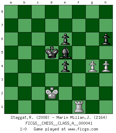 Last move : 1-0 2009 August 2 4:2:52 [Event "FICGS__CHESS__CLASS_A__000041"] [Site "FICGS"] [Date "2008.05.18"] [Round "1"] [White "Staggat,Rolf"] [Black "Marin Millan,Jose Antonio"] [Result "1-0"] [WhiteElo "2008"] [BlackElo "2164"] 1.e4 e5 2.Nf3 Nc6 3.Bb5 a6 4.Ba4 Nf6 5.O-O Be7 6.Re1 b5 7.Bb3 d6 8.c3 O-O 9.h3 Na5 10.Bc2 c5 11.d4 Qc7 12.Nbd2 cxd4 13.cxd4 Nc6 14.Nb3 a5 15.Be3 a4 16.Nbd2 Bd7 17.Rc1 Rfc8 18.Bd3 Qb7 19.a3 exd4 20.Nxd4 Ne5 21.Bb1 b4 22.f4 Rxc1 23.Qxc1 Ng6 24.Bd3 Rc8 25.Qd1 d5 26.e5 Ne4 27.Nxe4 dxe4 28.Bc2 Bc5 29.Bxa4 Bxa4 30.Qxa4 Nxf4 31.Bxf4 Bxd4+ 32.Kh2 g5 33.Qd1 Bf2 34.Re2 Bh4 35.Rd2 Qe7 36.Qg4 Qe6 37.Qxe6 fxe6 38.Be3 bxa3 39.bxa3 Be1 40.Re2 Bc3 41.Bxg5 Bxe5+ 42.Kg1 Rc4 43.Ra2 Ra4 44.Kf2 Kf7 45.Bc1 Bd6 46.Ke2 Kf6 47.Rc2 Bxa3 48.Ra2 Bxc1 49.Rxa4 Kf5 50.g3 Ke5 51.Ra1 Bb2 52.Rf1 h6 53.g4 Kd5 54.Kd2 Be5 55.h4 1-0 Ruy Lopez : Closed Kingside Castling by player White (move 5) Kingside Castling by player Black (move 8) 10 pieces endgame at move 48 : White KRPP , Black KRBPPP WHITE : King + 1 Rook 2 Pawns BLACK : King + 1 Rook 1 Bishop 3 Pawns 9 pieces endgame at move 49 : White KRPP , Black KBPPP WHITE : King + 1 Rook 2 Pawns BLACK : King + 1 Bishop 3 Pawns Player White won this chess game. Follow this game move after move (download)I still hope to kill Fischer. (Boris Spassky) Die Arbeit ist etwas Unnatürliches. Die Faulheit allein ist göttlich. (Anatole France) El Ajedrez es parte de una cultura y si una cultura esta en decadencia, entonces también el Ajedrez declinará. (Mikhail Botvinnik) Si rien de grave n'est détecté lors de l'analyse d'une position, on joue alors le coup. Seconde règle de Blumenfeld. I've never seen so many men wasted so badly. (Blondie in The Good, The Bad and The Ugly)