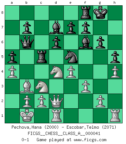 Last move : 0-1 2008 October 16 11:34:4 [Event "FICGS__CHESS__CLASS_A__000041"] [Site "FICGS"] [Date "2008.05.18"] [Round "1"] [White "Pechova,Hana"] [Black "Escobar,Telmo"] [Result "0-1"] [WhiteElo "2000"] [BlackElo "2071"] 1.e4 c5 2.Nf3 d6 3.d4 cxd4 4.Nxd4 Nf6 5.Nc3 g6 6.Be3 Bg7 7.f3 O-O 8.Qd2 Nc6 9.Bc4 Bd7 10.O-O-O Rc8 11.Bb3 Ne5 12.h4 h5 13.Bg5 Rc5 14.Kb1 a5 15.a4 Qb6 16.Bxf6 Bxf6 0-1 This chess game has been lost on time (started : 2008.05.18 10:11:30) Sicilian : Dragon, Yugoslav attack, 7...O-O Kingside Castling by player Black (move 7) Queenside Castling by player White (move 10) Player Black won this chess game. Follow this game move after move (download)All I want to do, ever, is just play Chess. (Bobby Fischer) Um sich vor der Gefahr einer Erkältung zu schützen, sorge der wanderlustige König beizeiten für ein brauchbares Versteck. (Aaron Nimzowitsch) Solo el jugador con la iniciativa tiene el derecho a atacar. (Wilhelm Steinitz) J'ai vu le vaincu d'Echecs jouer des années durant dans l'espoir de la fête de la victoire. Car tu es plus riche de ce qu'elle existe si même elle n'est point pour toi. Ainsi de la perle du fond des mers. (Antoine de Saint-Exupéry) There are two major products that came out of Berkeley: LSD and UNIX. We do not believe this is to be a coincidence. (Jeremy S. Anderson)