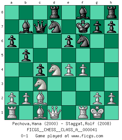 Last move : 0-1 2008 October 22 0:30:8 [Event "FICGS__CHESS__CLASS_A__000041"] [Site "FICGS"] [Date "2008.05.18"] [Round "1"] [White "Pechova,Hana"] [Black "Staggat,Rolf"] [Result "0-1"] [WhiteElo "2000"] [BlackElo "2008"] 1.d4 d5 2.c4 c6 3.Nf3 Nf6 4.Nc3 e6 5.e3 Nbd7 6.Bd3 dxc4 7.Bxc4 b5 8.Bd3 Bb7 9.O-O a6 10.e4 c5 11.d5 Qc7 12.dxe6 fxe6 13.Bc2 c4 14.Nd4 Kf7 15.f4 Rd8 0-1 This chess game has been lost on time (started : 2008.05.18 10:11:30) QGD Slav : 4.Nc3 Kingside Castling by player White (move 9) Player Black won this chess game. Follow this game move after move (download)We must make sure that Chess will not be like a dead language, very interesting, but for a very small group. (Sytze Faber) Frage: Was machen Sie mit den Preisen? Anwort: Ich habe Angst, dass meine Freundin davon neue Kleider kauft. (Loek van Wely) Aunque la mayoría de la gente disfruta observar las partidas de los grandes Maestros de ataque, algunos de los jugadores mas notables en la historia han sido los jugadores silenciosos posicionales. Lentamente ellos te aplastan despojandote de tu espacio, congestionando tus piezas y dejandote virtualmente sin nada que hacer. (Yasser Seirawan) Plusieurs personnes se sont demandées comment Tal faisait pour gagner... En fait, c'est très simple ! Il met ses pièces au centre de l'échiquier et les sacrifie quelque part ! (David Bronstein) Optimism is a variety of information deficit. Sometimes especially true for correspondence chess games. (Michael Aigner)