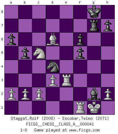 Last move : 1-0 2008 December 15 3:52:27 [Event "FICGS__CHESS__CLASS_A__000041"] [Site "FICGS"] [Date "2008.05.18"] [Round "1"] [White "Staggat,Rolf"] [Black "Escobar,Telmo"] [Result "1-0"] [WhiteElo "2008"] [BlackElo "2071"] 1.e4 c5 2.Nc3 Nc6 3.f4 g6 4.Nf3 Bg7 5.Bb5 Na5 6.O-O a6 7.Be2 b5 8.d3 Bb7 9.Qe1 e6 10.f5 Ne7 11.Bg5 f6 12.Be3 exf5 13.Bxc5 d6 14.Bf2 O-O 15.Nd4 Qc8 16.exf5 Nxf5 17.Bg4 Nc6 18.Qe6+ Qxe6 19.Nxe6 Rf7 20.Bxf5 gxf5 21.Bg3 Bh6 22.Bxd6 Be3+ 23.Kh1 Re8 24.Nc5 Ba8 25.Rae1 Nd4 26.Nd1 Rg7 27.Nxe3 Rxe3 28.Rxe3 Bxg2+ 29.Kg1 1-0 Sicilian : Grand Prix attack Kingside Castling by player White (move 6) Kingside Castling by player Black (move 14) Player White won this chess game. Follow this game move after move (download)Some sacrifices are sound; the rest are mine. (Mikhail Tal) Du musst nicht gut spielen, es reicht, wenn du besser spielst als dein Gegner. (Anonymous) Nunca nadie ha ganado una partida de Ajedrez rindiendose. (Unknown) Les ravages du H expliquent la différence de niveau entre Tal et Thal [Abergel]. Everybody lies. (Gregory House, House M.D.)