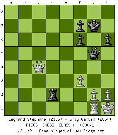 Last move : 1/2-1/2 2008 September 18 16:48:30 [Event "FICGS__CHESS__CLASS_A__000041"] [Site "FICGS"] [Date "2008.05.18"] [Round "1"] [White "Legrand,Stephane"] [Black "Gray,Garvin"] [Result "1/2-1/2"] [WhiteElo "2135"] [BlackElo "2050"] 1.e4 e6 2.d4 d5 3.Nd2 c5 4.Ngf3 Nf6 5.exd5 exd5 6.Bb5+ Bd7 7.Bxd7+ Nbxd7 8.O-O Be7 9.dxc5 Nxc5 10.Nb3 Nce4 11.Nfd4 O-O 12.Nf5 Re8 13.Nxe7+ Rxe7 14.Be3 Qc7 15.Bd4 Rae8 16.f3 Nd6 17.Bxf6 gxf6 18.Qxd5 Nc4 19.Qc5 Nxb2 20.Qxa7 Qxc2 21.Qf2 Re2 22.Qg3+ Kh8 23.Nd4 Qc5 24.Qf4 Qb6 25.Kh1 Nd3 26.Qh4 Rd2 27.Rab1 Nf2+ 28.Kg1 Nh3+ 29.Qxh3 Qxd4+ 30.Kh1 b6 31.a3 Rg8 32.Rg1 Rg6 33.Rb4 Qd3 34.Rh4 Rg5 35.a4 Kg7 36.Rh5 Rxh5 37.Qxh5 Qd4 38.Qh3 Qxa4 39.Qg3+ Kf8 40.Qb8+ Qe8 41.Qxb6 Kg7 42.Rc1 Qe5 43.Qb4 Qg5 44.Rg1 Re2 45.Qc3 h6 46.Qc4 Rd2 1/2-1/2 French : Tarrasch, Open variation Kingside Castling by player White (move 8) Kingside Castling by player Black (move 11) This chess game ended in a draw. Follow this game move after move (download)Suddenly it was obvious to me in my analysis I had missed what Fischer had found with the greatest of ease at the board. (Mikhail Botvinnik) Der zweitbeste Zug ist oft der einzig richtige. (Savielly Grigorievitsch Tartakower) La estratégia requiere pensar, la táctica requiere observación. (Max Euwe) La tactique est l'élément le plus important du milieu de jeu. (Siegbert Tarrasch) Players are not good because they find tactics, it is about the way to find the positions in which those tactics are hidden. (Luc-Olivier Leclerc)