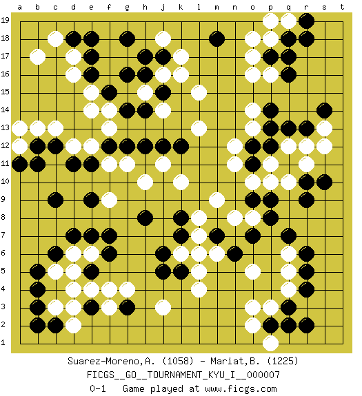 Last move : 0-1 2008 November 9 6:27:32 [Event "FICGS__GO__TOURNAMENT_KYU_I__000007"] [Site "FICGS"] [Date "2008.05.20"] [Round "1"] [Black "Suarez-Moreno,Alejandro"] [White "Mariat,Benoit"] [Result "0-1"] [Rating 1 "1058"] [Rating 2 "1225"] 1.q16 d4 2.q3 q5 3.r5 q4 4.r4 p3 5.r2 q6 6.r6 d16 7.c6 f4 8.b4 c3 9.c9 j3 10.q7 o5 11.p9 k16 12.g16 c13 13.g14 o17 14.p17 o16 15.p14 k10 16.j15 l15 17.p2 o3 18.k12 r11 19.r13 p11 20.r9 n11 21.e17 d17 22.j17 k17 23.k8 m9 24.o7 m6 25.m7 l7 26.k7 l8 27.k5 h10 28.h8 f9 29.f7 l4 30.l6 l5 31.n6 k6 32.j6 l6 33.j5 o2 34.m18 j18 35.g18 p18 36.q18 p16 37.q17 o18 38.b12 b13 39.c12 d12 40.d11 e12 41.e11 f11 42.f12 f13 43.g12 g11 44.h12 j11 45.j12 o14 46.p13 o13 47.g3 g4 48.e3 f3 49.c2 d2 50.b2 d3 51.b3 j16 52.h17 h15 53.h16 j14 54.h14 f14 55.f15 e15 56.e16 e14 57.d18 c18 58.e18 b17 59.e5 e4 60.e9 e6 61.f6 d5 62.e7 d6 63.d7 a12 64.a11 a13 65.b11 s13 66.s14 s12 67.s10 p1 68.q2 c5 69.b5 r12 70.q13 o8 71.o9 n8 72.p8 q19 73.r19 p19 74.r18 l13 75.p12 p10 76.o11 o10 77.o12 n12 78.q11 q10 79.r10 q12 0-1 Here are the names of the openings (joseki) played in the four corners : Corner q4 : q3 q5 Komoku (Somok, Xiao~mu`) 3-4 Point. The komoku (3-4) point is the traditional corner enclosure move.. Ikken Takagakari (Hankan Nop'dakeolch'im, Yi Gaogua`jiao~, 1-Space High Approach). The 5-4 approach move has become more popular in modern times, as modern Go emphasizes speed and influence. Corner d4 : d4 c6 Hoshi (Hwajeom, Seongjeom, Xingwei`) 4-4 Point. The star or hoshi (4-4) point, emphasizing influence at the potential expense of territory. Ikken Kakari (Hankan Keolch'im, Yi Gua`jiao~, 1-Space Low Approach). Black 2 is the standard approach move to the 4-4. Corner d16 : d16 g16 Hoshi (Hwajeom, Seongjeom, Xingwei`) 4-4 Point. The star or hoshi (4-4) point, emphasizing influence at the potential expense of territory. Nikken Takagakari (Dukan Nop'dakeolch'im, E`r Gaojia, 2-Space High Approach). Black 2 is a light approach move. Rarely played in even games, Black 2 is typically employed in handicap games. White continues with 6-4 or 3-10. In Korean Sunjang Baduk White has a stone on 8-4. Corner q16 : q16 o17 Hoshi (Hwajeom, Seongjeom, Xingwei`) 4-4 Point. The star or hoshi (4-4) point, emphasizing influence at the potential expense of territory. Ikken Kakari (Hankan Keolch'im, Yi Gua`jiao~, 1-Space Low Approach). White 2 is the standard approach move to the 4-4. Player White won this Go (weiqi, baduk) game. Follow this game move after move (download)There are possible things, impossible things, and things that happen. Sometimes things happen that were impossible. (Pierre Audouard) When you've done things right people won't know you've done anything at all. (Futurama)