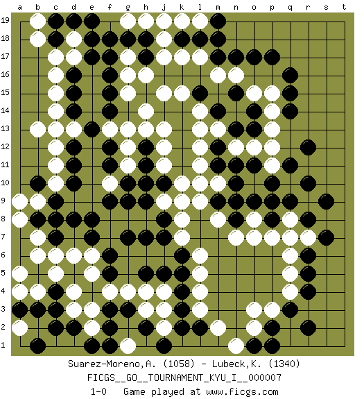 Last move : 1-0 2008 August 25 17:40:33 [Event "FICGS__GO__TOURNAMENT_KYU_I__000007"] [Site "FICGS"] [Date "2008.05.20"] [Round "1"] [Black "Suarez-Moreno,Alejandro"] [White "Lubeck,Kate"] [Result "1-0"] [Rating 1 "1058"] [Rating 2 "1340"] 1.q16 d4 2.q3 d17 3.d15 q5 4.r5 c15 5.d16 c16 6.e17 d18 7.d14 q4 8.r4 p3 9.r2 q6 10.r6 c14 11.f16 d13 12.e13 q7 13.r8 p9 14.f3 h3 15.f5 e6 16.h5 j4 17.p2 o3 18.d12 c12 19.c13 b13 20.d11 c11 21.d10 c10 22.g7 f8 23.e7 f7 24.d8 d6 25.f6 g8 26.h7 k7 27.k6 l6 28.j7 k8 29.k5 l5 30.k4 l4 31.k3 l3 32.l2 m2 33.k2 p15 34.q15 p14 35.q14 p12 36.o11 p11 37.o9 o8 38.n9 k10 39.m11 l12 40.k11 l11 41.m12 m13 42.o13 o12 43.n13 n12 44.m14 l13 45.n15 l14 46.l15 k15 47.k14 j15 48.j14 h14 49.k12 l10 50.h12 g12 51.h11 h13 52.k13 g11 53.j10 j9 54.g10 f10 55.h9 h8 56.j8 k9 57.f9 j12 58.e8 j13 59.g9 f13 60.f11 o15 61.o17 n14 62.o14 p13 63.r12 n16 64.n17 m16 65.m17 l17 66.l18 k17 67.k18 j18 68.c3 d3 69.b5 b6 70.c4 c5 71.d2 e2 72.c2 e3 73.f2 b4 74.b3 a5 75.e1 e5 76.c7 b7 77.c9 b9 78.p8 q8 79.p10 q10 80.q9 r9 81.r10 p9 82.f12 g13 83.q9 f4 84.s9 g4 85.h2 j3 86.g3 h4 87.n8 o7 88.h18 j19 89.h17 j17 90.f14 h16 91.e18 g17 92.g18 g16 93.f17 n7 94.c18 c17 95.d19 b18 96.c19 b19 97.e19 m8 98.m9 l9 99.n11 j2 100.j1 m10 101.n10 j11 102.h10 g19 103.f18 h19 104.q11 g15 105.f15 l19 106.m19 k19 107.m18 d13 108.j5 c13 109.b8 a8 110.c8 c6 111.b10 a9 112.p17 p7 113.p9 o2 114.o1 n1 115.p1 r7 116.s7 g1 117.f1 a2 118.a3 a4 119.b1 1-0 Here are the names of the openings (joseki) played in the four corners : Corner d16 : d17 d15 Komoku (Somok, Xiao~mu`) 3-4 Point. The komoku (3-4) point is the traditional corner enclosure move.. Ikken Takagakari (Hankan Nop'dakeolch'im, Yi Gaogua`jiao~, 1-Space High Approach). The 5-4 approach move has become more popular in modern times, as modern Go emphasizes speed and influence. Corner q4 : q3 q5 Komoku (Somok, Xiao~mu`) 3-4 Point. The komoku (3-4) point is the traditional corner enclosure move.. Ikken Takagakari (Hankan Nop'dakeolch'im, Yi Gaogua`jiao~, 1-Space High Approach). The 5-4 approach move has become more popular in modern times, as modern Go emphasizes speed and influence. Corner d4 : d4 f3 Hoshi (Hwajeom, Seongjeom, Xingwei`) 4-4 Point. The star or hoshi (4-4) point, emphasizing influence at the potential expense of territory. Ikken Kakari (Hankan Keolch'im, Yi Gua`jiao~, 1-Space Low Approach). Black 2 is the standard approach move to the 4-4. Corner q16 : q16 p15 Hoshi (Hwajeom, Seongjeom, Xingwei`) 4-4 Point. The star or hoshi (4-4) point, emphasizing influence at the potential expense of territory. Player Black won this Go (weiqi, baduk) game. Follow this game move after move (download)In an unreasonable situation, an unreasonable move is reasonable. (Tamino) Begin at the beginning and go on till you come to the end; then stop. (Lewis Carrol, Alice in Wonderland)