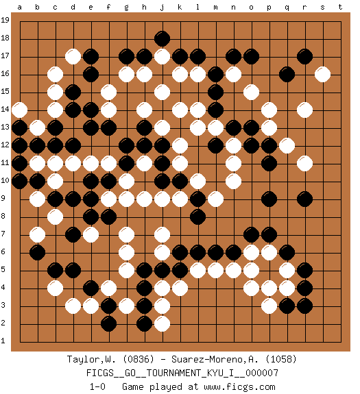 Last move : 1-0 2008 December 23 18:14:53 [Event "FICGS__GO__TOURNAMENT_KYU_I__000007"] [Site "FICGS"] [Date "2008.05.20"] [Round "1"] [Black "Taylor,William"] [White "Suarez-Moreno,Alejandro"] [Result "1-0"] [Rating 1 "0836"] [Rating 2 "1058"] 1.q16 d3 2.q3 c16 3.r9 q5 4.r5 q4 5.r4 p3 6.r3 o4 7.q6 k4 8.e17 d17 9.e16 d13 10.j16 r14 11.o17 s16 12.r17 r11 13.p9 p13 14.c5 c4 15.d5 f4 16.c9 c11 17.e9 n16 18.n17 l16 19.l17 l14 20.j14 k12 21.h12 k9 22.m15 o15 23.m16 f14 24.d15 c15 25.e14 f15 26.d14 c14 27.e13 e11 28.d12 d11 29.c13 b13 30.b12 a14 31.c12 g10 32.f10 f11 33.g11 h11 34.g12 f9 35.e10 h9 36.f8 g9 37.j11 k11 38.j10 j9 39.k10 l10 40.j12 n10 41.n6 n5 42.m6 m5 43.l9 m9 44.l8 j7 45.k6 j6 46.j5 j4 47.h5 g5 48.k5 g6 49.h4 l5 50.l6 e7 51.e8 g7 52.d7 p6 53.p5 p4 54.p7 o6 55.o7 o5 56.h2 j3 57.h3 j2 58.m14 m13 59.n13 n12 60.m12 l13 61.o12 n11 62.o13 p14 63.p12 q12 64.p11 b7 65.b6 c8 66.d9 b9 67.b10 b11 68.a11 c10 69.a10 a12 70.a13 j13 71.h13 a12 72.e4 e3 73.a13 h14 74.a12 j15 75.k13 k14 76.f13 k16 77.k17 h16 78.h17 g16 79.g17 j17 80.j18 j13 81.f3 g3 82.f2 1-0 Here are the names of the openings (joseki) played in the four corners : Corner d16 : c16 e17 Komoku (Somok, Xiao~mu`) 3-4 Point. The komoku (3-4) point is the traditional corner enclosure move.. Ikken Kakari (Hankan Keolch'im, Yi Gua`jiao~, 1-Space Low Pincer). The small knight move is the basic approach move to the 3-4 point stone. It has been continually used for over four centuries. There are limitless variations, with new moves constantly being discovered. Black 2 opens the door to a treaure store of joseki. Corner q16 : q16 r14 Hoshi (Hwajeom, Seongjeom, Xingwei`) 4-4 Point. The star or hoshi (4-4) point, emphasizing influence at the potential expense of territory. Ikken Kakari (Hankan Keolch'im, Yi Gua`jiao~, 1-Space Low Approach). White 2 is the standard approach move to the 4-4. Corner d4 : d3 c5 Komoku (Somok, Xiao~mu`) 3-4 Point. The komoku (3-4) point is the traditional corner enclosure move.. Ikken Kakari (Hankan Keolch'im, Yi Gua`jiao~, 1-Space Low Pincer). The small knight move is the basic approach move to the 3-4 point stone. It has been continually used for over four centuries. There are limitless variations, with new moves constantly being discovered. Black 2 opens the door to a treaure store of joseki. Player Black won this Go (weiqi, baduk) game. Follow this game move after move (download)Don't make dango's. (Anonymous) There's no money in correspondence chess. (John Knudsen)