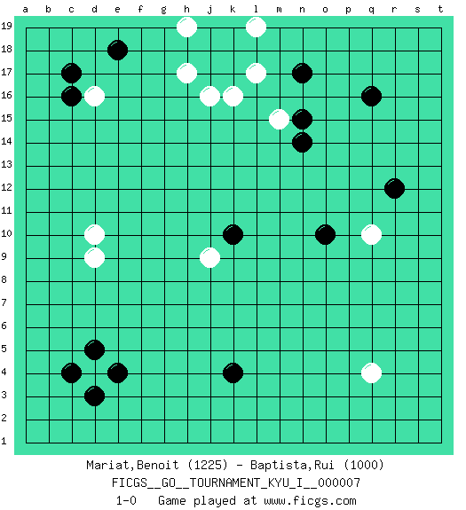 Last move : 1-0 2008 July 30 4:45:52 [Event "FICGS__GO__TOURNAMENT_KYU_I__000007"] [Site "FICGS"] [Date "2008.05.20"] [Round "1"] [Black "Mariat,Benoit"] [White "Baptista,Rui"] [Result "1-0"] [Rating 1 "1225"] [Rating 2 "1000"] 1.q16 k16 2.d5 q10 3.k10 d10 4.k4 q4 5.d3 d16 6.c17 d4 7.e4 j9 8.o10 j16 9.c16 d9 10.c4 h17 11.n17 l17 12.n15 l19 13.r12 h19 14.e18 m15 15.n14 1-0 This go game has been lost on time (started : 2008.05.20 8:14:11) Here are the names of the openings (joseki) played in the four corners : Corner d16 : d16 c17 Hoshi (Hwajeom, Seongjeom, Xingwei`) 4-4 Point. The star or hoshi (4-4) point, emphasizing influence at the potential expense of territory. Player Black won this Go (weiqi, baduk) game. Follow this game move after move (download)... {it is} something unearthly... if there are sentient beings on other planets, then they play go. (Emanuel Lasker, chess world champion) Now be brave and don't look back. Don't look back. (Shmi Skywalker in Star Wars ep.1)