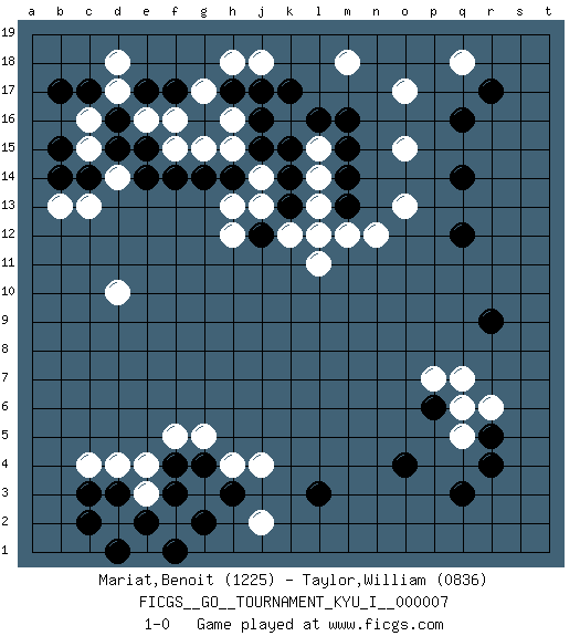 Last move : 1-0 2008 November 15 15:55:6 [Event "FICGS__GO__TOURNAMENT_KYU_I__000007"] [Site "FICGS"] [Date "2008.05.20"] [Round "1"] [Black "Mariat,Benoit"] [White "Taylor,William"] [Result "1-0"] [Rating 1 "1225"] [Rating 2 "0836"] 1.q16 d4 2.q3 d17 3.d15 c15 4.c14 c16 5.r9 d10 6.g14 o17 7.m16 o15 8.q14 q18 9.r17 m18 10.k17 o13 11.q12 q5 12.r5 r6 13.r4 q7 14.p6 q6 15.o4 p7 16.f3 j4 17.l3 j2 18.c3 c4 19.d3 e4 20.f4 e3 21.e2 d2 22.c2 f2 23.d1 f5 24.g2 g3 25.g4 g5 26.h3 h4 27.f1 g17 28.e17 e16 29.d16 f16 30.c17 d18 31.b17 d14 32.e15 c13 33.b14 b13 34.b15 h15 35.m14 m12 36.h14 j14 37.k13 j13 38.m13 k12 39.k14 n12 40.l12 l11 41.j12 l13 42.j15 h13 43.j16 l14 44.k15 l15 45.l16 h16 46.m15 l12 47.h17 h18 48.j17 j18 49.g16 f15 50.e14 g15 51.f14 h12 52.f17 1-0 Here are the names of the openings (joseki) played in the four corners : Corner d16 : d17 d15 Komoku (Somok, Xiao~mu`) 3-4 Point. The komoku (3-4) point is the traditional corner enclosure move.. Ikken Takagakari (Hankan Nop'dakeolch'im, Yi Gaogua`jiao~, 1-Space High Approach). The 5-4 approach move has become more popular in modern times, as modern Go emphasizes speed and influence. Corner q16 : q16 o17 Hoshi (Hwajeom, Seongjeom, Xingwei`) 4-4 Point. The star or hoshi (4-4) point, emphasizing influence at the potential expense of territory. Ikken Kakari (Hankan Keolch'im, Yi Gua`jiao~, 1-Space Low Approach). White 2 is the standard approach move to the 4-4. Corner d4 : d4 f3 Hoshi (Hwajeom, Seongjeom, Xingwei`) 4-4 Point. The star or hoshi (4-4) point, emphasizing influence at the potential expense of territory. Ikken Kakari (Hankan Keolch'im, Yi Gua`jiao~, 1-Space Low Approach). Black 2 is the standard approach move to the 4-4. Player Black won this Go (weiqi, baduk) game. Follow this game move after move (download)Josekis are not fixed, definitive things. They indicate the moments when everything can change. (Pierre Audouard) Those parts of the system that you can hit with a hammer (not advised) are called hardware; those program instructions that you can only curse at are called software. (Anonymous)