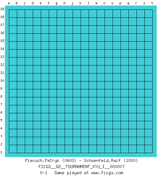 Last move : 0-1 2008 June 19 12:43:51 [Event "FICGS__GO__TOURNAMENT_KYU_I__000007"] [Site "FICGS"] [Date "2008.05.20"] [Round "1"] [Black "Piecuch,Patryk"] [White "Schoenfeld,Ralf"] [Result "0-1"] [Rating 1 "0600"] [Rating 2 "1000"] 0-1 This go game has been lost on time (started : 2008.05.20 8:14:11) Here are the names of the openings (joseki) played in the four corners : Player White won this Go (weiqi, baduk) game. Follow this game move after move (download)Good moves and bad moves are bedfellows. (Anonymous) The production of too many useful things results in too many useless people. (Karl Marx)