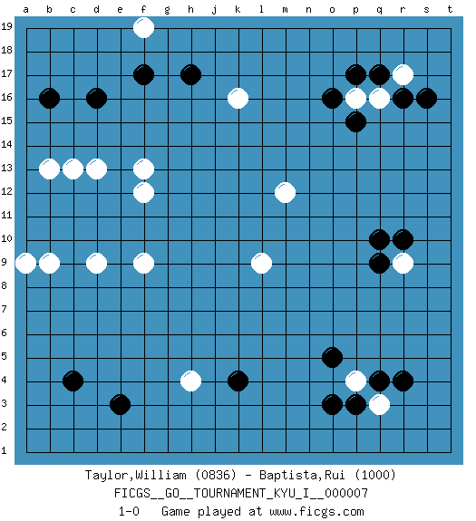 Last move : 1-0 2008 August 17 18:15:57 [Event "FICGS__GO__TOURNAMENT_KYU_I__000007"] [Site "FICGS"] [Date "2008.05.20"] [Round "1"] [Black "Taylor,William"] [White "Baptista,Rui"] [Result "1-0"] [Rating 1 "0836"] [Rating 2 "1000"] 1.r16 l9 2.d16 f9 3.q4 r9 4.c4 k16 5.p17 d13 6.f17 p4 7.p3 q3 8.r4 q16 9.q17 h4 10.e3 m12 11.o3 r17 12.s16 f12 13.p15 b13 14.b16 d9 15.o5 f19 16.h17 p16 17.o16 b9 18.q10 c13 19.k4 f13 20.r10 a9 21.q9 1-0 This go game has been lost on time (started : 2008.05.20 8:14:11) Here are the names of the openings (joseki) played in the four corners : Corner q4 : l9 q4 This joseki is unknown. A weak or weird move has probably been played in this corner. Corner d4 : f9 c4 This joseki is unknown. A weak or weird move has probably been played in this corner. Corner d16 : d16 d13 Hoshi (Hwajeom, Seongjeom, Xingwei`) 4-4 Point. The star or hoshi (4-4) point, emphasizing influence at the potential expense of territory. Nikken Takagakari (Dukan Nop'dakeolch'im, E`r Gaojia, 2-Space High Approach). White 2 is a light approach move. Rarely played in even games, White 2 is typically employed in handicap games. Black continues with 6-4 or 3-10. In Korean Sunjang Baduk Black has a stone on 8-4. Player Black won this Go (weiqi, baduk) game. Follow this game move after move (download)White is always trying to kill a bigger group than black is trying to save. (Anonymous) Beta. Software undergoes beta testing shortly before it's released. Beta is latin for still doesn't work. (Anonymous)