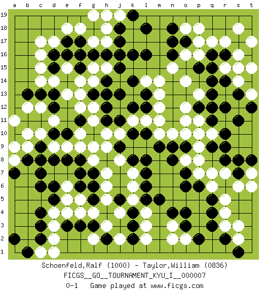 Last move : 0-1 2008 December 24 9:25:17 [Event "FICGS__GO__TOURNAMENT_KYU_I__000007"] [Site "FICGS"] [Date "2008.05.20"] [Round "1"] [Black "Schoenfeld,Ralf"] [White "Taylor,William"] [Result "0-1"] [Rating 1 "1000"] [Rating 2 "0836"] 1.r16 d4 2.q3 d17 3.d15 c15 4.d16 c16 5.e17 c17 6.h16 d14 7.f15 r5 8.o4 r3 9.q4 r4 10.q5 q6 11.p6 q7 12.r9 p7 13.o6 p9 14.q11 p16 15.q14 r17 16.q16 q17 17.o17 o16 18.n17 p17 19.l16 o14 20.f3 h3 21.k3 f4 22.e3 e4 23.c2 g4 24.c9 e9 25.d12 f13 26.f11 g9 27.c6 c8 28.d8 d9 29.c7 c10 30.b8 g11 31.e14 e13 32.d13 c14 33.c11 b10 34.d10 b12 35.b11 a11 36.e10 f10 37.b13 c12 38.c4 d3 39.c3 d2 40.n8 o11 41.f6 h6 42.g7 h7 43.f8 f9 44.e8 e18 45.f17 l4 46.k4 k5 47.l5 l3 48.k2 l2 49.m5 o2 50.o3 n2 51.p2 j4 52.h2 g2 53.l13 l11 54.k8 f18 55.g18 g17 56.f16 h18 57.j18 h17 58.j17 s16 59.s15 r15 60.q15 s14 61.r14 t15 62.s13 r15 63.c13 d11 64.s15 j16 65.g16 g19 66.j15 r15 67.j5 k6 68.l6 k7 69.l7 s15 70.s17 s18 71.g3 j2 72.g5 h5 73.k10 k11 74.j13 j10 75.h11 g12 76.h12 h10 77.l10 m10 78.m9 n10 79.r2 s2 80.s1 s3 81.s7 s6 82.r8 m14 83.g13 f12 84.j11 l14 85.k14 m13 86.l12 m12 87.k12 m11 88.p10 o10 89.o9 o8 90.n9 q10 91.q9 p11 92.r10 p10 93.q12 o18 94.n18 p18 95.n16 t13 96.t12 s12 97.t14 t17 98.s11 t13 99.r12 g14 100.h13 f14 101.o7 p8 102.h8 g8 103.g6 j8 104.j9 h9 105.l8 j19 106.k19 h19 107.l18 c1 108.b1 d1 109.a2 t7 110.t8 t6 111.h14 e15 112.e16 r7 113.s8 n15 114.p15 n3 115.n4 p13 116.p12 o12 117.q13 e6 118.d6 f5 119.f7 h15 120.k16 g15 121.j16 b9 122.d5 e5 123.c8 a8 124.a7 a9 0-1 Here are the names of the openings (joseki) played in the four corners : Corner d16 : d17 d15 Komoku (Somok, Xiao~mu`) 3-4 Point. The komoku (3-4) point is the traditional corner enclosure move.. Ikken Takagakari (Hankan Nop'dakeolch'im, Yi Gaogua`jiao~, 1-Space High Approach). The 5-4 approach move has become more popular in modern times, as modern Go emphasizes speed and influence. Corner q4 : q3 r5 Komoku (Somok, Xiao~mu`) 3-4 Point. The komoku (3-4) point is the traditional corner enclosure move.. Ikken Kakari (Hankan Keolch'im, Yi Gua`jiao~, 1-Space Low Pincer). The small knight move is the basic approach move to the 3-4 point stone. It has been continually used for over four centuries. There are limitless variations, with new moves constantly being discovered. White 2 opens the door to a treaure store of joseki. Corner d4 : d4 f3 Hoshi (Hwajeom, Seongjeom, Xingwei`) 4-4 Point. The star or hoshi (4-4) point, emphasizing influence at the potential expense of territory. Ikken Kakari (Hankan Keolch'im, Yi Gua`jiao~, 1-Space Low Approach). Black 2 is the standard approach move to the 4-4. Player White won this Go (weiqi, baduk) game. Follow this game move after move (download)Take the cutting stone on the second line. (Anonymous) Philosophers use a language that is already deformed as though by shoes that are too tight. (Ludwig Wittgenstein)