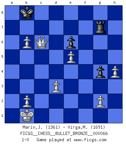 Last move : 1-0 2009 February 4 0:53:0 [Event "FICGS__CHESS__BULLET_BRONZE__000066"] [Site "FICGS"] [Date "2009.02.04"] [Round "1"] [White "Marin,John"] [Black "Virga,Maurizio Pietro"] [Result "1-0"] [WhiteElo "1361"] [BlackElo "1691"] 1.e4 c5 2.Nf3 d6 3.d4 cxd4 4.Nxd4 Nf6 5.Nc3 Nc6 6.Bg5 e6 7.Qd2 a6 8.O-O-O h6 9.Be3 Bd7 10.f3 b5 11.Kb1 Ne5 12.f4 Neg4 13.a3 Nxe3 14.Qxe3 Qc8 15.e5 dxe5 16.fxe5 Nd5 17.Nxd5 exd5 18.Qg3 g5 19.h4 g4 20.Qf4 h5 21.Bd3 Qc5 22.Rhf1 Qe7 23.Bf5 Be6 24.Qe3 Rh6 25.Bxe6 fxe6 26.Rxf8+ Qxf8 27.Qc3 Rd8 28.Qc6+ Ke7 29.Qc7+ Ke8 30.Nc6 Ra8 31.Qb7 Rd8 32.Nxd8 Qe7 33.Qxa6 Kxd8 34.Qa8+ Kd7 35.Rf1 Rh7 36.Rf8 Qxf8 37.Qxf8 Re7 38.Qh6 b4 39.axb4 Rf7 40.Qxh5 Rg7 41.b5 Kc7 42.Qe8 d4 43.Qc6+ Kb8 44.b6 d3 45.cxd3 1-0 This chess game has been lost on time (started : 2009.02.04 0:13:37) Comment by player 2 : Maurizio Pietro Virga : he is using a chess software i'm sure about it, and this is not fare Sicilian : Richter-Rauzer, Rauzer attack, 7...a6 Queenside Castling by player White (move 8) Player White won this chess game. Follow this game move after move (download)If one piece is badly posted, the whole game is bad. (Tarrasch) Vielleicht wirkt die Aura früherer Spieler glanzvoller als die der heutigen Spieler, aber das liegt daran, dass man kein Programm wie Fritz hatte, das einem all die Löcher in ihren Partien zeigt. (Vladimir Kramnik) Aunque la mayoría de la gente disfruta observar las partidas de los grandes Maestros de ataque, algunos de los jugadores mas notables en la historia han sido los jugadores silenciosos posicionales. Lentamente ellos te aplastan despojandote de tu espacio, congestionando tus piezas y dejandote virtualmente sin nada que hacer. (Yasser Seirawan) Les Echecs sont et restent toujours un combat, un combat intégral comme la boxe, la lutte ou un autre sport, et où il doit y avoir un vainqueur et un vaincu. (Joseph Emil Diemer) Always remember that you are unique; just like everyone else. (Unknown)