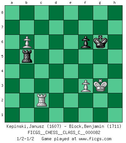 Last move : 1/2-1/2 2008 September 19 18:59:52 [Event "FICGS__CHESS__CLASS_C__000082"] [Site "FICGS"] [Date "2008.05.21"] [Round "1"] [White "Kepinski,Janusz"] [Black "Block,Benjamin"] [Result "1/2-1/2"] [WhiteElo "1607"] [BlackElo "1711"] 1.d4 d5 2.c4 c6 3.Nf3 Nf6 4.Nc3 e6 5.e3 Nbd7 6.Qc2 Bd6 7.Be2 O-O 8.O-O dxc4 9.Bxc4 b5 10.Be2 Bb7 11.e4 e5 12.dxe5 Nxe5 13.Nxe5 Bxe5 14.Bg5 h6 15.Bh4 Qb6 16.Rad1 Rfe8 17.a3 g5 18.Bg3 Bxc3 19.Qxc3 Nxe4 20.Qf3 Nxg3 21.hxg3 c5 22.Qg4 c4 23.Bf3 Bxf3 24.Qxf3 Rad8 25.Rxd8 Rxd8 26.Re1 Kg7 27.Re7 Qf6 28.Qe2 Rd3 29.Re4 Qd6 30.Qc2 Rd1+ 31.Kh2 Rd2 32.Qc3+ Kg6 33.f3 Qd3 34.Qxd3 Rxd3 35.a4 a6 36.axb5 axb5 37.Re2 b4 38.Re4 c3 39.Rxb4 c2 40.Rc4 Rd2 41.g4 h5 42.Rc6+ f6 43.gxh5+ Kxh5 44.b4 g4 45.Kg3 gxf3 46.gxf3 Kg6 47.b5 Rd5 48.b6 Rb5 49.Rxc2 1/2-1/2 QGD Slav : 4.Nc3 Kingside Castling by player Black (move 7) Kingside Castling by player White (move 8) 10 pieces endgame at move 43 : White KRPPP , Black KRPPP WHITE : King + 1 Rook 3 Pawns BLACK : King + 1 Rook 3 Pawns 9 pieces endgame at move 45 : White KRPP , Black KRPPP WHITE : King + 1 Rook 2 Pawns BLACK : King + 1 Rook 3 Pawns 8 pieces endgame at move 46 : White KRPP , Black KRPP WHITE : King + 1 Rook 2 Pawns BLACK : King + 1 Rook 2 Pawns 7 pieces endgame at move 49 : White KRPP , Black KRP WHITE : King + 1 Rook 2 Pawns BLACK : King + 1 Rook 1 Pawn This chess game ended in a draw. Follow this game move after move (download)The sign of a great Master is his ability to win a won game quickly and painlessly. (Irving Chernev) Der 70jährige Viktor Kortschnoi: Die Rentenanstalt wollte mich zwingen in Rente zu gehen. Meine Frau erhält jetzt eine Pension- und ich zahle weiter in die Rentenkasse ein! (Viktor Kortschnoi) No es suficiente ser un buen jugador, se debe también de jugar bién. (Siegbert Tarrasch) À la honte des hommes, on sait que les lois du jeu sont les seules qui soient partout justes, claires, inviolables et exécutées. Pourquoi l'Indien qui a donné les règles du jeu d'échecs est-il obéi de bon gré dans toute la terre, et que les décrétales des papes, par exemple, sont aujourd'hui un objet d'horreur et de mépris ? C'est que l'inventeur des échecs combina tout avec justesse pour la satisfaction des joueurs, et que les papes, dans leurs décrétales, n'eurent en vue que leur seul avantage. L'Indien voulut exercer également l'esprit des hommes et leur donner du plaisir; les papes ont voulu abrutir l'esprit des hommes. Voltaire (Dictionnaire philosophique / Garnier 1967) Animated gif is worth one mega-word. (Unknown)
