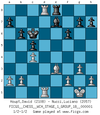 Last move : 1/2-1/2 2006 August 25 13:31:4 [Event "FICGS__CHESS__WCH_STAGE_1_GROUP_18__000001"] [Site "FICGS"] [Date "2006.07.19"] [Round "1"] [White "Houpt,David"] [Black "Nucci,Luciano"] [Result "1/2-1/2"] [WhiteElo "2108"] [BlackElo "2057"] 1.e4 e6 2.d4 d5 3.Nc3 dxe4 4.Nxe4 Nd7 5.g3 Ngf6 6.Nxf6+ Nxf6 7.Bg2 e5 8.Qe2 Qxd4 9.Nf3 Qd5 10.O-O e4 11.Ng5 Bg4 12.Qe3 Bf5 13.Re1 Bd6 14.Nxe4 Bxe4 15.Bxe4 Nxe4 16.Qxe4+ Qxe4 17.Rxe4+ Kd7 18.Rd4 c5 19.Rd5 Kc6 20.c4 Rhe8 21.Be3 Be7 22.Rf5 f6 23.Rd5 Rad8 24.Rad1 b6 25.Rxd8 1/2-1/2 French : Rubinstein variation Kingside Castling by player White (move 10) This chess game ended in a draw. Follow this game move after move (download)No price is too great for the scalp of the enemy King. (Koblentz) Unter Putin wird alles Geld aus Russland wie von einem Staubsauger nach Moskau umgeleitet, das ist wie ein schwarzes Loch. (Garry Kasparov) Juega la Apertura como un libro, el Juego Medio como un mago y los Finales como una máquina. (Spielmann) La vie est comme un jeu d'échecs : nous esquissons un plan, mais celui-ci est tributaire de ce que daignent faire l'adversaire aux échecs et le destin dans la vie. (Arthur Schopenhauer) What doesn't kill us makes us stronger. (Friedrich Nietzsche)