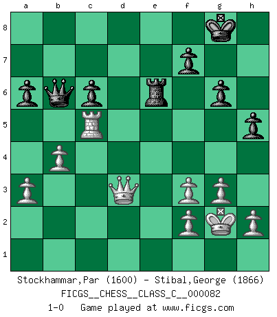 Last move : 1-0 2008 July 13 4:30:37 [Event "FICGS__CHESS__CLASS_C__000082"] [Site "FICGS"] [Date "2008.05.21"] [Round "1"] [White "Stockhammar,Par"] [Black "Stibal,George"] [Result "1-0"] [WhiteElo "1600"] [BlackElo "1866"] 1.Nf3 Nf6 2.c4 e6 3.g3 c5 4.Bg2 Nc6 5.O-O d5 6.cxd5 exd5 7.d4 Be6 8.Nc3 a6 9.Bg5 Be7 10.dxc5 O-O 11.Na4 d4 12.Bf4 Nd5 13.Bd6 Bxd6 14.cxd6 Qxd6 15.Nxd4 Rad8 16.Rc1 Qe5 17.Nxc6 bxc6 18.Rc5 Qb8 19.Qc1 Rfe8 20.Bf3 Nb4 21.a3 Na2 22.Qb1 Bb3 23.Nc3 Nxc3 24.Rxc3 Rd6 25.Rfc1 Bd5 26.b4 Bxf3 27.exf3 Qc8 28.Rd1 Red8 29.Rxd6 Rxd6 30.Kg2 g6 31.Qe4 Qa8 32.Qf4 Qd8 33.Rc5 h5 34.Qc4 Qb6 35.Qe2 Re6 36.Qd3 1-0 Reti Opening Kingside Castling by player White (move 5) Kingside Castling by player Black (move 10) Player White won this chess game. Follow this game move after move (download)I look one move ahead... the best ! (Siegbert Tarrasch) Im Leben werden Partien nie so unstrittig gewonnen wie im Spiel (Emanuel Lasker) No es tiempo de jugar al Ajedrez cuando la casa esta en llamas. (Proverbio Italiano) Aucun coup ne doit être joué sans but. (Pedro Damiano) A proverb is a short sentence based on long experience. (Miguel de Cervantes)