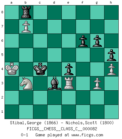 Last move : 0-1 2008 July 13 4:22:53 [Event "FICGS__CHESS__CLASS_C__000082"] [Site "FICGS"] [Date "2008.05.21"] [Round "1"] [White "Stibal,George"] [Black "Nichols,Scott"] [Result "0-1"] [WhiteElo "1866"] [BlackElo "1800"] 1.e4 c5 2.Nf3 d6 3.d4 cxd4 4.Nxd4 Nf6 5.Nc3 g6 6.Be3 Bg7 7.f3 O-O 8.Qd2 Nc6 9.Bc4 Bd7 10.O-O-O Rc8 11.Bb3 Na5 12.h4 Nxb3+ 13.axb3 h5 14.Bg5 Re8 15.Kb1 Nh7 16.Bh6 Bh8 17.Qd3 Nf6 18.Bg5 Qa5 19.g3 a6 20.Rhe1 b5 21.Bxf6 Bxf6 22.Nd5 Bg7 23.b4 Qd8 24.Qd2 e6 25.Ne3 Qf6 26.c3 d5 27.exd5 e5 28.Nb3 Qxf3 29.Nc5 Rcd8 30.Qg2 Qxg2 31.Nxg2 Bf8 32.Kc2 Bc8 33.Ne4 Kg7 34.Kb3 Bg4 35.Rd3 Be6 36.Red1 Bf5 37.Re3 Bh3 38.Ne1 f6 39.Nc2 Be6 40.Red3 Bf5 41.Re3 Rd7 42.Nc5 Bxc5 43.bxc5 Rc8 44.Nb4 Rxc5 45.Nxa6 Rcxd5 46.Rxd5 Rxd5 47.c4 bxc4+ 48.Kxc4 Rd6 49.Nc5 Rd4+ 50.Kb5 Kf7 51.b4 Ke7 52.Nb3 Bd3+ 53.Ka4 Rd8 54.b5 e4 55.b6 Kd6 56.Na5 Rb8 57.b7 Kc5 58.Nb3+ Kc4 0-1 Sicilian : Dragon, Yugoslav attack, 7...O-O Kingside Castling by player Black (move 7) Queenside Castling by player White (move 10) Player Black won this chess game. Follow this game move after move (download)Not only will I predict his triumph over Botvinnik, but I'll go further and say that he'll probably be the greatest Chess player that ever lived. (John Collins) Es genügt nicht ein guter Spieler zu sein, man muß auch gut spielen. (Siegbert Tarrasch) Buenas posiciones no logran ganar juegos, buenas movidas sí. (Gerald Abrahams) Echiquier : carré parfait, comme la Jérusalem nouvelle décrite par l'auteur de l'Apocalypse, huit cases sur huit, exaltation du chiffre 4, symbole du cosmos aux quatre horizons... où le noir et le blanc, l'ombre et la lumière, le mal et le bien s'entremêlent et se conjuguent. (Robert Couffignal, Le Gambit du poète) A clear conscience is usually the sign of a bad memory. (Unknown)