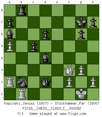 Last move : 0-1 2008 July 19 21:3:19 [Event "FICGS__CHESS__CLASS_C__000082"] [Site "FICGS"] [Date "2008.05.21"] [Round "1"] [White "Kepinski,Janusz"] [Black "Stockhammar,Par"] [Result "0-1"] [WhiteElo "1607"] [BlackElo "1600"] 1.c4 Nf6 2.d4 e6 3.Nf3 b6 4.g3 Bb7 5.Bg2 Be7 6.O-O O-O 7.Nc3 Ne4 8.Bd2 Nxd2 9.Qxd2 d6 10.e4 Nd7 11.b4 c5 12.bxc5 bxc5 13.d5 Rb8 14.dxe6 fxe6 15.Rfe1 Ba6 16.Bf1 Rxf3 17.Bg2 Ne5 18.Nb5 Nxc4 19.Qd1 Rf7 20.a4 Bf6 21.e5 Bxe5 22.Ra2 Qa5 23.Bh3 Bxb5 24.Bxe6 Ba6 25.Bxf7+ Kxf7 26.Qd5+ Kf8 27.Qe4 g6 28.Rc1 Nb2 29.Rb1 Qd2 30.Qf3+ Kg7 31.a5 Bd4 0-1 English, 1...Nf6 (Anglo-Indian defense) Kingside Castling by player White (move 6) Kingside Castling by player Black (move 6) Player Black won this chess game. Follow this game move after move (download)It was clear to me that the vulnerable point of the American Grandmaster (Bobby Fischer) was in double-edged, hanging, irrational positions, where he often failed to find a win even in a won position. (Efim Geller) Fischer ist das größte Genie, das je vom Schachhimmel heruntergestiegen ist. (Mikhail Nekhemyevich Tal) El Ajedrez expande y enriquece tu mente. (Saudin Robovic) Des points faibles ou des trous dans la position de l'adversaire doivent être occupés par des pièces et non pas par des pions. (Siegbert Tarrasch) Life is painting a picture, not doing a sum. (Oliver Wendell Holmes, Jr.)