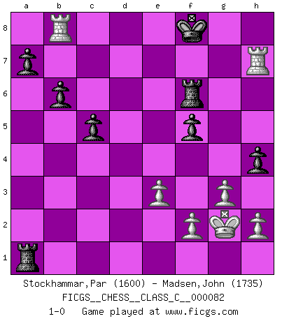 Last move : 1-0 2008 July 14 12:22:39 [Event "FICGS__CHESS__CLASS_C__000082"] [Site "FICGS"] [Date "2008.05.21"] [Round "1"] [White "Stockhammar,Par"] [Black "Madsen,John"] [Result "1-0"] [WhiteElo "1600"] [BlackElo "1735"] 1.Nf3 b6 2.g3 Bb7 3.Bg2 e6 4.c4 f5 5.O-O Nf6 6.d4 Be7 7.Nc3 O-O 8.Bf4 Ne4 9.Qd3 Na6 10.a3 c5 11.d5 Nxc3 12.bxc3 d6 13.dxe6 Be4 14.Qe3 Nc7 15.Ng5 Bxg2 16.Kxg2 Qc8 17.Rad1 Bxg5 18.Bxg5 Qxe6 19.Qxe6+ Nxe6 20.Be7 Rfe8 21.Bxd6 Nd8 22.Rfe1 Re4 23.Bf4 Rxc4 24.Rd7 Nf7 25.Rc7 g5 26.Be3 Rxc3 27.Rd1 Rxa3 28.R1d7 Rf8 29.Bxg5 Nxg5 30.Rg7+ Kh8 31.Rxg5 h6 32.Rg6 h5 33.e3 h4 34.R6g7 Rf6 35.Rh7+ Kg8 36.Rcg7+ Kf8 37.Rb7 Ra1 38.Rb8+ 1-0 Comment by player 2 : John Madsen : How could I forget?! But thanks for the game! Reti Opening Kingside Castling by player White (move 5) Kingside Castling by player Black (move 7) Player White won this chess game. Follow this game move after move (download)My God, Bobby Fischer plays so simply. (Alexei Suetin) Smyslow ist ein Beweis dafür, dass ich noch zehn Jahre spielen kann! [der 75 jährige über den 85 jährigen] (Viktor Kortschnoi) El Ajedrez es de 30 a 40 por ciento psicología. Uno no cuenta con esto cuando se juega contra una computadora. No lo puedo confundir. (Judith Polgar) Donnez-moi un Cavalier en 6e et je gagnerais toutes mes parties. (Steinitz) No enterprise is more likely to succeed than one concealed from the enemy until it is ripe for execution. (Niccolo Machiavelli)