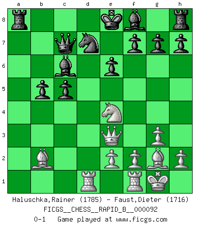 Last move : 0-1 2008 July 13 2:53:55 [Event "FICGS__CHESS__RAPID_B__000092"] [Site "FICGS"] [Date "2008.05.21"] [Round "1"] [White "Haluschka,Rainer"] [Black "Faust,Dieter"] [Result "0-1"] [WhiteElo "1785"] [BlackElo "1716"] 1.d4 d5 2.Nf3 c6 3.c4 dxc4 4.g3 e6 5.Bg2 Nf6 6.O-O b5 7.a4 Bb7 8.Ne5 a6 9.b3 cxb3 10.Qxb3 Qxd4 11.Bb2 Qb6 12.Nc3 Nbd7 13.Nxd7 Nxd7 14.Ne4 c5 15.Qe3 Qc7 16.axb5 axb5 17.Rad1 Bc6 0-1 This chess game has been lost on time (started : 2008.05.21 15:25:12) Queen's pawn game Kingside Castling by player White (move 6) Player Black won this chess game. Follow this game move after move (download)In life, as in Chess, one's own Pawns block one's way. A man's very wealth, ease, leisure, children, books, which should help him to win, more often checkmate him. (Charles Buxton) Jeder weiß, dass Gasprom Putins persönliches Machtinstrument ist. Die Firma wird vom Kreml aus geleitet und wird schon deshalb nie transparent sein. (Garry Kasparov) El Ajedrez expande y enriquece tu mente. (Saudin Robovic) La vie est comme un jeu d'échecs : nous esquissons un plan, mais celui-ci est tributaire de ce que daignent faire l'adversaire aux échecs et le destin dans la vie. (Arthur Schopenhauer) I don't know, I don't care, and it doesn't make any difference. (Albert Einstein)